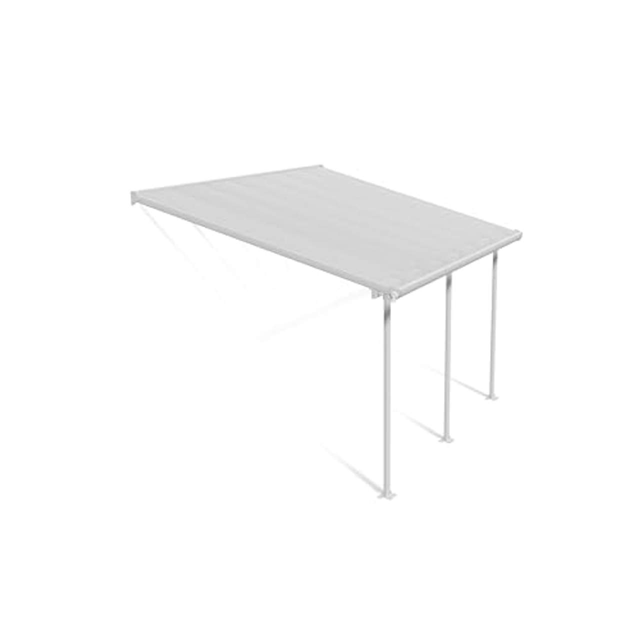 TERRANDO Palram Feria Terrassenüberdachung ist ein Terrassenüberdachungsprodukt von TERRANDO. Sie besteht aus 8 mm starken, UV-beständigen Polycarbonatplatten und einer Konstruktion aus Aluminium und verzinktem Stahl, die wartungsfrei und rost- und korrosionsbeständig ist. Die Überdachung lässt natürliches Sonnenlicht herein und spendet Schatten an sonnigen Tagen. Es hat eine verstellbare Höhe für eine flexible Anwendung, unterstützt eine Schneelast von 150 kg/m², Farbe weiß/transparent. Abmessungen: 425 x 295 x 285-305 cm, Gewicht 83,5 kg