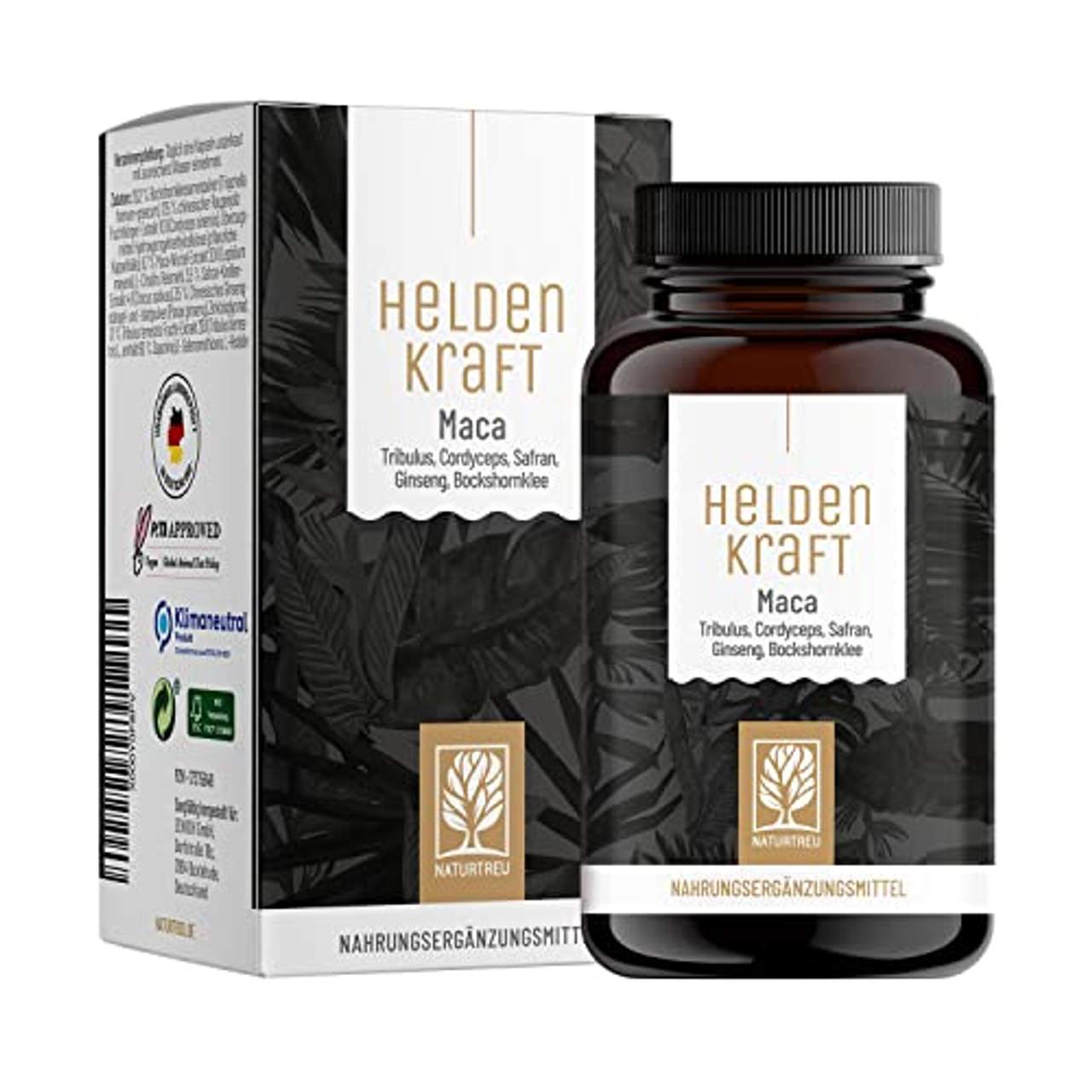 NATURTREU Maca Kapseln hochdosiertHeldenkraft - DER Unvergleichbare Maca-Komplex: Informationen IM Überblick Jede Tagesdosis Heldenkraft (3 Kapseln) enthält: Maca: 3.000 mg aus 150 mg 20:1 Maca-Wurzelextrakt Cordyceps: 3.000 mg aus 300 mg 10:1 Cordyceps sinesis Fruchtkörperextrakt Tribulus Terrestris: 600 mg (enthält 90% Saponine) aus 30 mg 20:1 Tribulus Terrestris Fruchtextrakt Bockshornklee:500 mg aus Bockshornkleesamenpulver Ginseng & Safran: 60 mg Ginseng aus Chinesisches Ginsengstängel- und -blattpulver, sowie 60 mg Safran aus Safran-Knollenextrakt Essenzielle Aminosäuren & Mineralstoffe: Mit 10 mg Zink, 55 μg Selen, 10 mg L-Histidin und 135 mg L-Citrullin Reinheit: ohne Gentechnik, ohne Magnesiumstearat und ohne Zusatz-, Füllstoffe oder sonstige Aromen Ein sicheres Gefühl: Unabhängige Laborprüfungen auf Belastung und Wirkstoffgehalt werden regelmäßig durchgeführt Zink trägt zur Erhaltung eines normalen Testosteronspiegels im Blut bei.trägt zu einer normalen Fruchtbarkeit und einer normalen Reproduktion (Fortpflanzungsfähigkeit) bei. trägt zur Erhaltung normaler Haare bei. trägt zu einem normalen Stoffwechsel von Makronährstoffen bei. trägt zu einer normalen kognitiven Funktion bei. trägt zu einer normalen Funktion des Immunsystems (körperliche Abwehr) bei.Selen trägt zu einer normalen Schilddrüsenfunktion bei. trägt dazu bei, die Zellen vor oxidativem Stress zu schützen. trägt zu einer normalen Funktion des Immunsystems (körperliche Abwehr) bei. trägt zu einer normalen Spermabildung (Bildung von Samenzellen) bei.