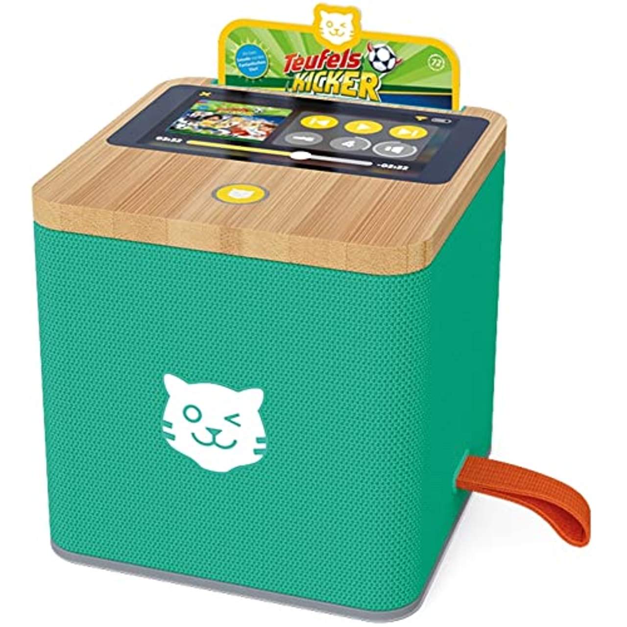 Tigermedia 1203 tigerbox Touch Streaming-BoxDie digitale Revolution fürs KinderzimmerDie tigerbox TOUCH ? macht Streaming zum KinderspielCDs waren gestern! Mit der neuen tigerbox TOUCH streamen Kinder jetzt sicher und ohne Werbung die beliebtesten Hörspiele, Hörbücher und Kinderlieder mit ihrer eigenen Hörbox.Das kann keine andere Hörbox und kein Smartphone!Die tigebox TOUCH bietet als geschlossenes System größte Datensicherheit und volle Kostenkontrolle für alle kleinen und großen Hörspiel-Fans. Mit beeindruckendem Stereo Klang und kindgerechter Bedienung dank Karteneinschub und Touchdisplay können Kinder jetzt selbstständig und sorgenfrei die große Online-Hörspielwelt entdecken ? ganz ohne die Hilfe eines Erwachsenen.Für jedes Alter etwas dabei! Die tigerbox TOUCH bietet zwei Wege zum Lieblingshörspiel: tigercard und tigerticket. Die tigercards machen Hörspiel-Spaß so einfach, wie nie zuvor. Einfach einstecken und sofort spielt die tigerbox TOUCH den Inhalt ab.Das tigerticket aktiviert den Premium-Zugang zum Streamingdienst von tigertones mit über 3.000 Titeln. Damit lassen sich beliebte Inhalte, die eigene Playlist und die neuesten Hörgeschichten kinderleicht über das Touchdisplay abrufen.Ohne Vertragsbindung und ohne Onlinekäufe! Alle Inhalte mit den tigercards und dem tigerticket wurden sorgfältig geprüft und sind 100% werbefrei.So garantiert die tigerbox TOUCH viele spannende Hörstunden mit Abenteuern und Musik für Kids zwischen 3 und 10 Jahren.Inklusive Startpaket!Jede tigerbox TOUCH enthält bereits eine tigercard mit einem beliebten Titel sowie ein tigerticket für 1 Monat kostenlosen Hörspaß. Das bedeutet maximales Hörerlebnis ab der ersten Minute!Die tigerbox TOUCH gibt es in Lila, Schwarz und Grün mit jeweils einer anderen tigercard. Hol dir jetzt die neue tigerbox TOUCH und lege Freiheit und Fantasie in kleine Entdeckerhände.Lieferumfang:tigerbox TOUCH GrünInklusive Startpaket: tigerticket für 1 Monat kostenlosen Stream, tigercard mit Hörbuch: Teufelskicker ? Freundschaftsspiel!USB-C-Ladekabel & NetzteilEmpfohlen von 3 bis 10 JahrenTechnische Details:3,9" Touchdisplay: Kinderleichte Bedienung, ganz ohne einen ErwachsenenBeeindruckender Stereo-Klang; 2 x 2,4 Watt Leistung und einstellbarer Lautstärkereglementierung: abgestimmt auf KinderohrenWLAN-Verbindung in die online Hörspielwelt zum Streamen mit tigerticketTigerkopf-Nachtlicht für ruhige Gute-Nacht-GeschichtenLED-Stripes: dezente Lichtshow angepasst auf die Audio-WiedergabeRundherum geknüpfter Stoff; schmutzabweisend und mit toller HaptikBambus-Front: nachhaltiges Echtholz für volles KlangerlebnisKopfhöreranschluss für 3,5 mm Stereo KlinkensteckerBis zu 8h Akkulaufzeit8 GB interner Flash-Speicher für mehr als 80 Hörspiele und KinderliederMaße: 115 mm x 110 mm x 115 mm