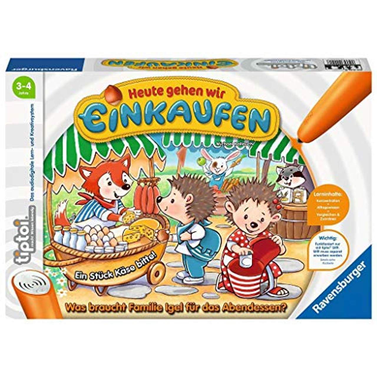 Ravensburger tiptoi 00041 „Heute gehen wir einkaufen“Heute Abend gibt es lecker Pfannkuchen. Welche Zutaten brauchen wir dafür? Auf dem Weg zum Markt erzählt tiptoi den Spielern, woher unser Essen kommt. Milch geben die Kühe und Eier gibt es bei den Hühnern auf dem Bauernhof.Mehl wird aus goldgelben Körnern gemahlen. Schau mal, an einem Marktstand wird frisches Gemüse verkauft. Gibt es dort die Zutaten für die Tomatensoße? Laufe zum Markt und kaufe an den verschiedenen Ständen die Zutaten für dein Lieblingsgericht.Spielerisch erwerben die Kinder Alltagswissen und verbessern ihre Konzentration.Ob alleine oder gemeinsam:tiptoi erklärt die Regeln und führt durch das Spiel. Bekannte und neue Lieder, liebevolle Illustrationen und realistische Geräusche erwecken die Welt zum Leben.Für den tiptoi Einstieg ab 3 Jahren. Kurze Texte, einfache Handhabung und begleitende Informationen für Eltern.Was ist tiptoi?tiptoi ist ein innovatives Lern- und Kreativsystem, mit dem Kinder die Welt spielerisch entdecken. Das tiptoi Sortiment umfasst Bücher, Spiele und Spielzeug mit den wichtigsten Lern- und Wissensthemen für Kinder ab 3 Jahren. Tippt man mit dem Stift auf ein Bild oder einen Text, erklingen passende Geräusche, Sprache oder Musik.Die kostenlosen Audiodateien lädt man sich einfach, sicher und schnell über den tiptoi Manager auf den Stift.Über RavensburgerSeit 1884 steht die Marke Ravensburger für Spiel & Spaß mit Qualität. Das deutsche Unternehmen wurde als Verlag in Ravensburg gegründet und erfreut seitdem Groß und Klein mit einem breiten Produktangebot von Spielen über Puzzle bis hin zu Büchern und Bastelmaterialien. Neben Spaß wird bei Ravensburger das Lernen groß geschrieben:Der Grundsatz des Gründers Otto Maier lautete damals schon „Lernen durch Tun“ und wird bis heute fortgeführt. So unterstützen die Produkte von Ravensburger spielerisch die Entwicklung von Fähigkeiten für jedes Alter. Toll durchdachte Spiele, ausgeführt in hochwertiger Verarbeitung:Dafür steht das blaue Dreieck von Ravensburger.