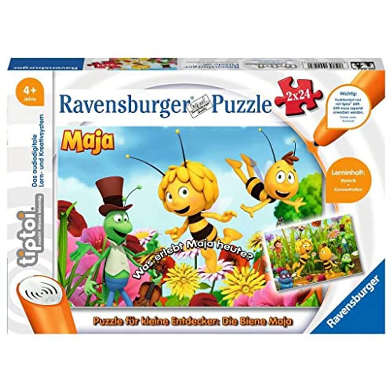 Ravensburger tiptoi 00047 Puzzletiptoi Puzzle für kleine Entdecker: Die Biene MajaWo lebt die Biene Maja? Wie heißt ihr bester Freund? Und was für ein Abenteuer erlebt sie heute? Wenn das Puzzle zusammengesetzt ist, gehen die Spieler mit tiptoi auf Entdeckungsreise und tauchen in die Welt von Biene Maja ein.Spannendes Wissen über die neugierige Biene und ihre Freunde, sowie lustige Spiele runden das Puzzle-Erlebnis ab. Auf der Klatschmohnwiese gibt es jede Menge zu entdecken! Der Puzzlespaß im Doppelpack mit 2x24 Teilen fördert zudem die Motorik und die Konzentration.Was ist tiptoi?tiptoi ist ein innovatives Lern- und Kreativsystem, mit dem Kinder die Welt spielerisch entdecken. Das tiptoi Sortiment umfasst Bücher, Spiele und Spielzeug mit den wichtigsten Lern- und Wissensthemen für Kinder ab 3 Jahren. Tippt man mit dem Stift auf ein Bild oder einen Text, erklingen passende Geräusche, Sprache oder Musik.Die kostenlosen Audiodateien lädt man sich einfach, sicher und schnell über den tiptoi Manager auf den Stift.Über RavensburgerSeit 1884 steht die Marke Ravensburger für Spiel & Spaß mit Qualität. Das deutsche Unternehmen wurde als Verlag in Ravensburg gegründet und erfreut seitdem Groß und Klein mit einem breiten Produktangebot von Spielen über Puzzle bis hin zu Büchern und Bastelmaterialien. Neben Spaß wird bei Ravensburger das Lernen groß geschrieben:Der Grundsatz des Gründers Otto Maier lautete damals schon „Lernen durch Tun“ und wirdbis heute fortgeführt. So unterstützen die Produkte von Ravensburger spielerisch die Entwicklung von Fähigkeiten für jedes Alter. Toll durchdachte Spiele, ausgeführt in hochwertiger Verarbeitung:Dafür steht das blaue Dreieck von Ravensburger.