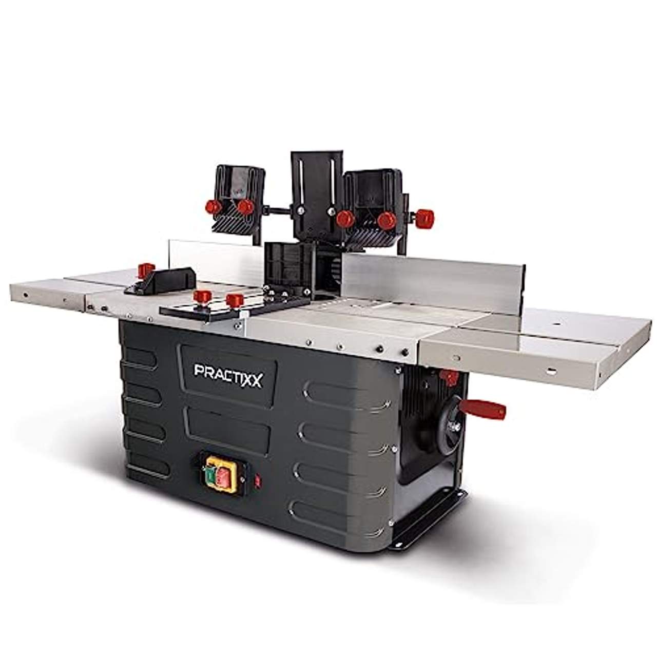 Practixx Fräsmaschine PX-TFM40 TischfräsmaschineDie kompakte PX-TFM-40 Holzfräsmaschine von Practixx ist ein praktisches Tischmodell, das bei Bedarf auch mobil eingesetzt werden kann. Einen festen Stand erhält die Tischfräsmaschine durch ihre stabile Konstruktion und das Eigengewicht von knapp 21 kg. Durch die beidseitigen Tischverbreiterungen bietet die komprimiert konstruierte Fräsmaschine eine angenehm große Fläche zum Arbeiten.Kompaktes Tisch-Modell Variable Drehzahlregulierung von 11500 bis 24000 min-1 Spannzangen von Ø 6, 8 und 12 mm Leistungsstarker 1500 Watt Motor Serienmäßig mit Winkelanschlag und groß dimensionierten Aluminiumanschlägen Beidseitige Tischverbreiterungen, Tischgröße 610 x 360 mm Einstellbare Spindelhöhe von 0 bis 40 mm Tischfräsmaschinen werden gerne in der Hobbywerkstatt beispielsweise zum Herstellen von Schlitzen, Nuten oder anderen Aussparungen verwendet. Die PX-TFM-40 von Practixx ist ein praktisches und kompaktes Tischmodell, das bei Bedarf sogar mobil eingesetzt werden kann.Die PX-TFM-40 eignet sich für den Einsatz von Fräsern bis zu einem Durchmesser von maximal 50 mm. Die stabile Konstruktion und ein Gewicht von knapp 21 kg sorgen für einen besonders stabilen und sicheren Stand der Holzfräse.Mit einer Tischgröße von 610 x 360 mm findet die Holzfräsmaschine auch in kleinen Werkstätten Platz. Die beidseitig integrierten Tischverbreiterungen vergrößern die Tischoberfläche zusätzlich und ermöglichen so auch problemlos das Bearbeiten großer Werkstücke sowie das Ausführen besonderer Fräsarbeiten. Die Spindelhöhe und damit die Höhe des Fräsmessers wird ganz einfach durch ein Drehen an einer Handkurbel an der Seite der Maschine eingestellt.Die gewünschte Höhe kann stufenlos von 0-40 mm eingestellt werden und wird anschließend mit einer Klemmschraube fixiert. Zur Befestigung der Werkstücke auf dem Frästisch sind im Lieferumfang drei Spannvorrichtungen mit 6, 8 und 12 mm enthalten, So wird eine gute Führung und sichere Handhabung ermöglicht. Dank der variablen Drehzahlregulierung von 11500 bis 24000 Umdrehungen pro Minute kann das Werkstück optimal bearbeitet werden. Der 1500 W Motor sorgt außerdem für ausreichend Leistung. Serienmäßig ist die PX-TFM-40 zudem mit einem Winkelanschlag sowie besonders groß dimensionierten Aluminiumanschlägen, die das Werkstück an Ort und Stelle halten, ausgestattet.