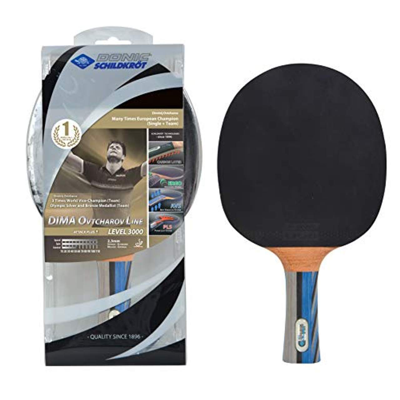 Donic-Schildkröt Tischtennisschläger Ovtcharov 3000Der \Dima Ovtcharov 3000 Carbon\ von Donic-Schildkröt ist das Spitzenmodell dieser zukunftsweisenden Schlägerserie. Optimal geeignet ist der Schläger für den extrem ambitionierten Freizeitsport und das sehr regelmäßige Hobbyspiel. Das verwendete 5CC Competition Carbon Holz ist das beste und härteste Holz\, das Donic-Schildkröt heute einsetzt. Es bietet durch die beiden Carbon-Lagen im Funier ein Maximum an Härte und Steifheit für maximale Kontrolle und eine höchstmögliche Energiewiedergabe. Es ist extrem schnell und bietet beste Ballkontrolle. Der ITTF-zugelassene Liga-Belag aus dem Hause Donic punktet mit bestem Grip und überträgt den Spin sehr effektiv auf den Ball.Der zwischen Belag und Holz befindliche 2\,3mm(!) starke Schwamm generiert ein hohes Maß an Power. Höchste Ballgeschwindigkeiten bei gleichem Krafteinsatz sind der Vorteil gegenüber einem dünneren und somit preiswerteren Schwamm. Der ERGO-Griff mit abgerundetem\, fließendem Übergang vom Griff zum Schlägerblatt liegt deutlich besser in der Hand als klassische Schläger und vermeidet Druckstellen am Zeigefinger. Diese im Wettkampfsport etablierte Technologie ermöglicht schnellstmögliches Umgreifen von Vor- auf Rückhand (und umgekehrt)\, ein klarer Pluspunkt bei schnellen Tischtennis-Duellen. Auch die PLS-Technologie (\Power Light System\) fällt sofort ins Auge: dank der transparenten Linse kann man durch den hohlen Schlägergriff hindurchschauen. Diese Konstruktion sorgt dafür\, dass der Schläger leichter und kopflastiger wird\, das Resultat ist ein sehr angenehmes Handling und optimierte Power. Das eingebaute \AVS\ (Anti Vibrations System - 2 schockabsorbierende PU-Schaum Einlagen unter jeder der beiden Griffschalen) zwischen Blatt und Griff reduziert Vibrationen und Schwingungen spürbar und ermöglicht so ein ermüdungsfreieres Spiel bei viel Kontrolle.Donic genießt weltweit einen hervorragenden Ruf im Tischtennis Wettkampf-Segment und ist Ausrüster zahlreicher bekannter Spitzenspieler.Die deutsche Traditionsmarke Schildkröt ist weit über 100 Jahre am Markt etabliert und gilt als Erfinder des Tischtennisballs. Donic-Schildkröt ist heute unangefochtener Marktführer im Bereich Freizeit-Tischtennis in Zentraleuropa. Produziert wird in der BSCI zertifizierten Schildkröt-Fabrik in China unter höchsten Sozialstandards.
