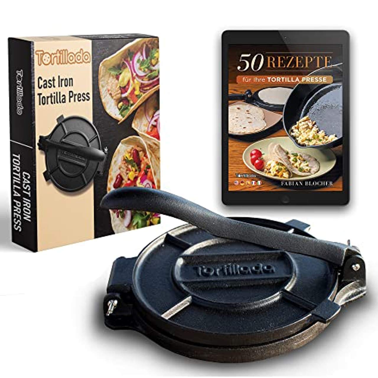 Tortillada Tortilla PresseGUSSEISEN - Die Tortilla Presse von Tortillada ist „pre- seasoned“ und wurde aus hochwertigem Gusseisen hergestellt. Mit Hilfe der Presse können Sie traditionelle Maistortillas selbst herstellen. HOCHWERTIG - Zur Herstellung dieser Presse verwenden wir hochwertiges Gusseisen. Damit das Gusseisen langlebig ist, ist eine entsprechende Handhabung &, Pflege notwendig. Wir haben Hinweise zur Pflege dem Artikel beigelegt. ANLEITUNG &, REZEPTE - Im Paket befindet sich ebenfalls eine Anleitung, sowie ein Rezept für die Herstellung von Burritos mit Maistortillas.GEWICHT &, GRÖßE - Die Tortillapresse ist 25cm lang und somit perfekt für die Zubereitung von schönen und großen Tortillas geeignet. Die Tortillapresse wiegt 5,4 kg. KUNDENSERVICE - Wir sind ein deutscher Anbieter und können Ihnen Kundenservice an 7 Tagen in der Woche anbieten. Falls Sie mit dem Artikel nicht zufrieden sind, so können Sie uns jederzeit einfach eine Nachricht senden und wir melden uns innerhalb von 24 Stunden bei Ihnen.