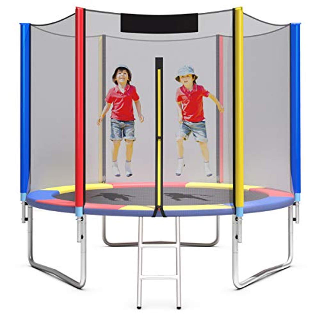 - Strapazierfähige Oberfläche und einfacher Einstieg: Dieses wetterfeste Trampolin ist sonnenlicht- und wasserbeständig und somit ideal für den langfristigen Einsatz im Freien. Die hochbelastbare Leiter aus verzinktem Stahl hilft Ihren Kindern, schnell auf das Trampolin zu gelangen, und der doppelte Reißverschluss ermöglicht es Ihnen, das Netz sowohl von außen als auch von innen bequem zu öffnen.