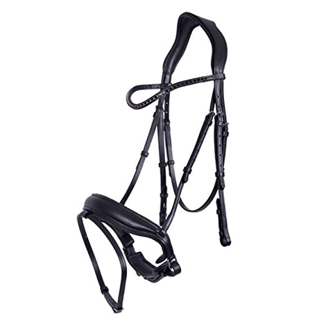 - Stil: Die Trense hat einen schmalen, geschwungenen Stirnriemen, der mit großen schwarzen Strasssteinen besetzt ist und ihr ein luxuriöses und stilvolles Aussehen verleiht.