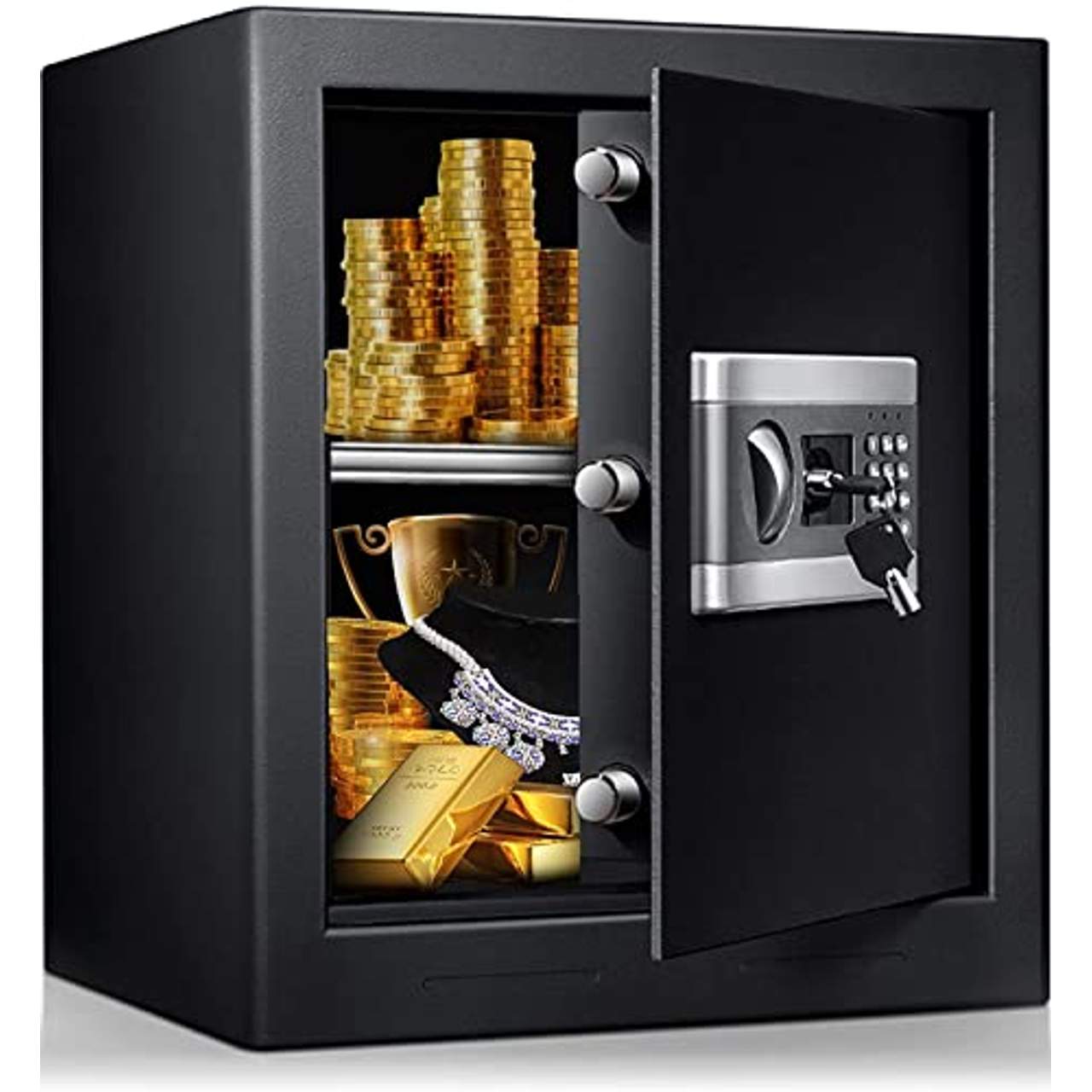 - Zwei Wege zum Öffnen: Der Tresorraum ist sowohl mit einem digitalen PIN-Code als auch mit Notschlüsseln ausgestattet. Sie können einen 1- bis 8-stelligen Code als Ihr eigenes Passwort programmieren oder die 2 Notschlüssel für den Zugang zu Ihrem Tresor verwenden.