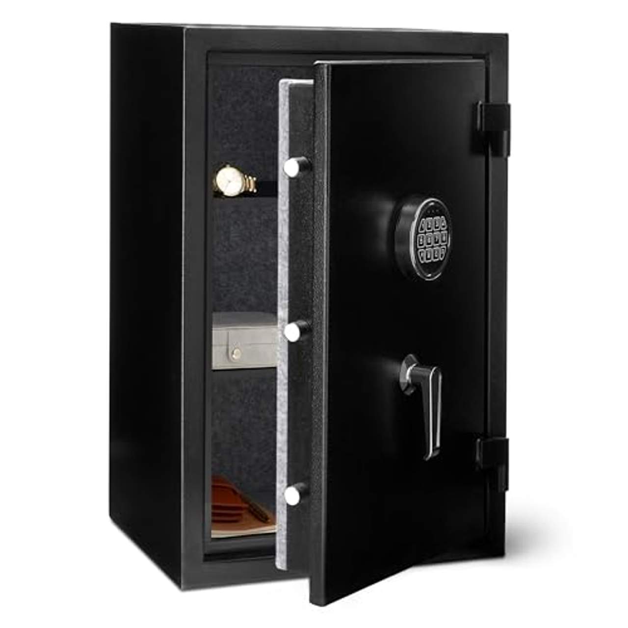 - Vielseitigkeit: Ein verstellbarer Einlegeboden ermöglicht es Ihnen, den Stauraum zu optimieren und größere Gegenstände wie Dokumente oder digitale Medien mühelos in den Safe zu legen.