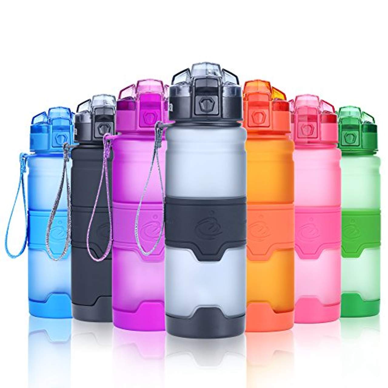 - Einfach zu tragen und zu benutzen: Das ergonomische Design dieser Wasserflasche macht es einfach, sie mit einer Hand zu benutzen, während der robuste Trageriemen und das reflektierende, gefrostete Gehäuse dafür sorgen, dass man sie in jeder Umgebung bequem tragen kann. Zusätzlich sorgt die Silikonschicht um die Flasche herum für einen rutschfesten Griff für zusätzlichen Komfort in Ihrer Hand.