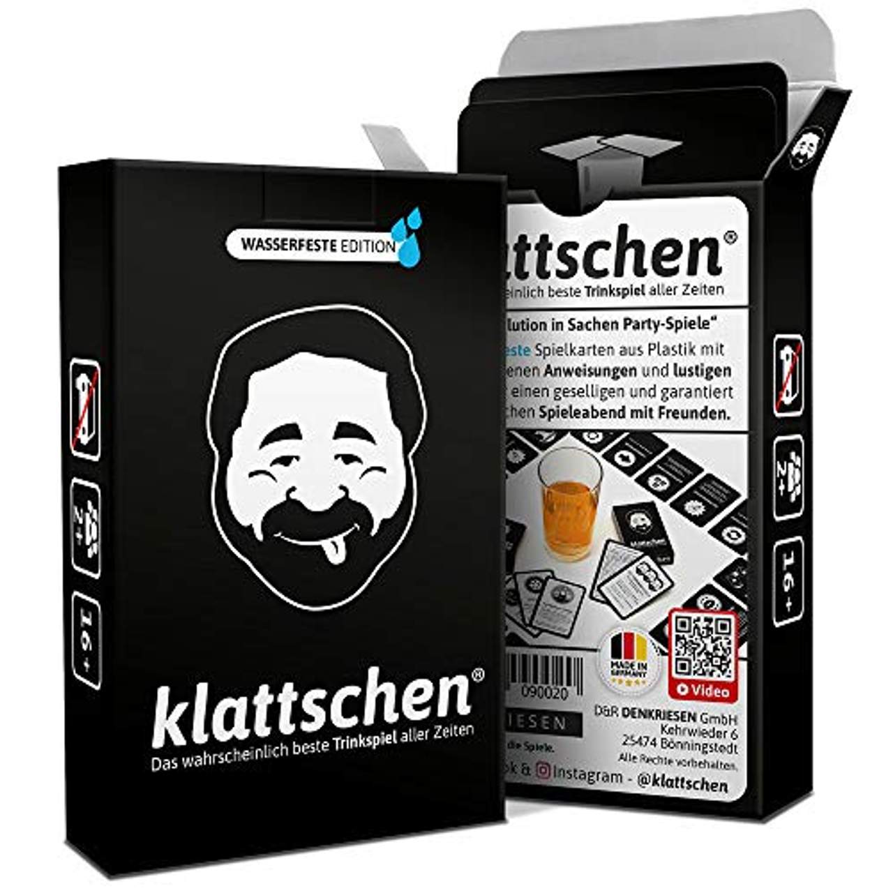 DENKRIESEN klattschenENTDECKE DIE REVOLUTION IN SACHEN PARTYSPIELE – KLATTSCHEN – DAS WAHRSCHEINLICH BESTE TRINKSPIEL ALLER ZEITENÜber das Spiel:Langweilige Party in Sicht? Nicht mit diesem Spiel!mit dem Kult-Trinkspiel klattschen der Marke DENKRIESEN hast du das perfekte Spiel um einen feucht-fröhlichen Abend mit deinen Freunden zu erleben. klattschen ist das meistverkaufte Karten-Trinkspiel Deutschlands und besteht aus 60 Spielkarten mit 25 verschiedenen Aufgaben und Anweisungen.Wer sich nicht an die Anweisungen hält oder einen Fehler bei der Ausführung macht, muss trinken (im Spiel ‘klattschen’ genannt).Außerdem müssen sich alle Spieler während des gesamten Spiels an die 3 Grundregeln halten:1. Nicht was Wort ‘trinken’ benutzen (auch nicht: getrunken, trank, trinkst usw.)2. Immer mit der linken Hand trinken!.3. Nicht fluchen!Über klattschen:DIE REVOLUTION IN SACHEN PARTYSPIELE Kult-Trinkspiel mit 60 Spielkarten (ohne Glas) – Oft kopiert doch nie erreichtVIELE VERSCHIEDENE REGELN UND AUFGABEN – 25 verschiedene Aufgaben und Anweisungen SUPER GESCHENKIDEE – klattschen ist KULT damit eine coole Geschenkidee zum Geburtstag