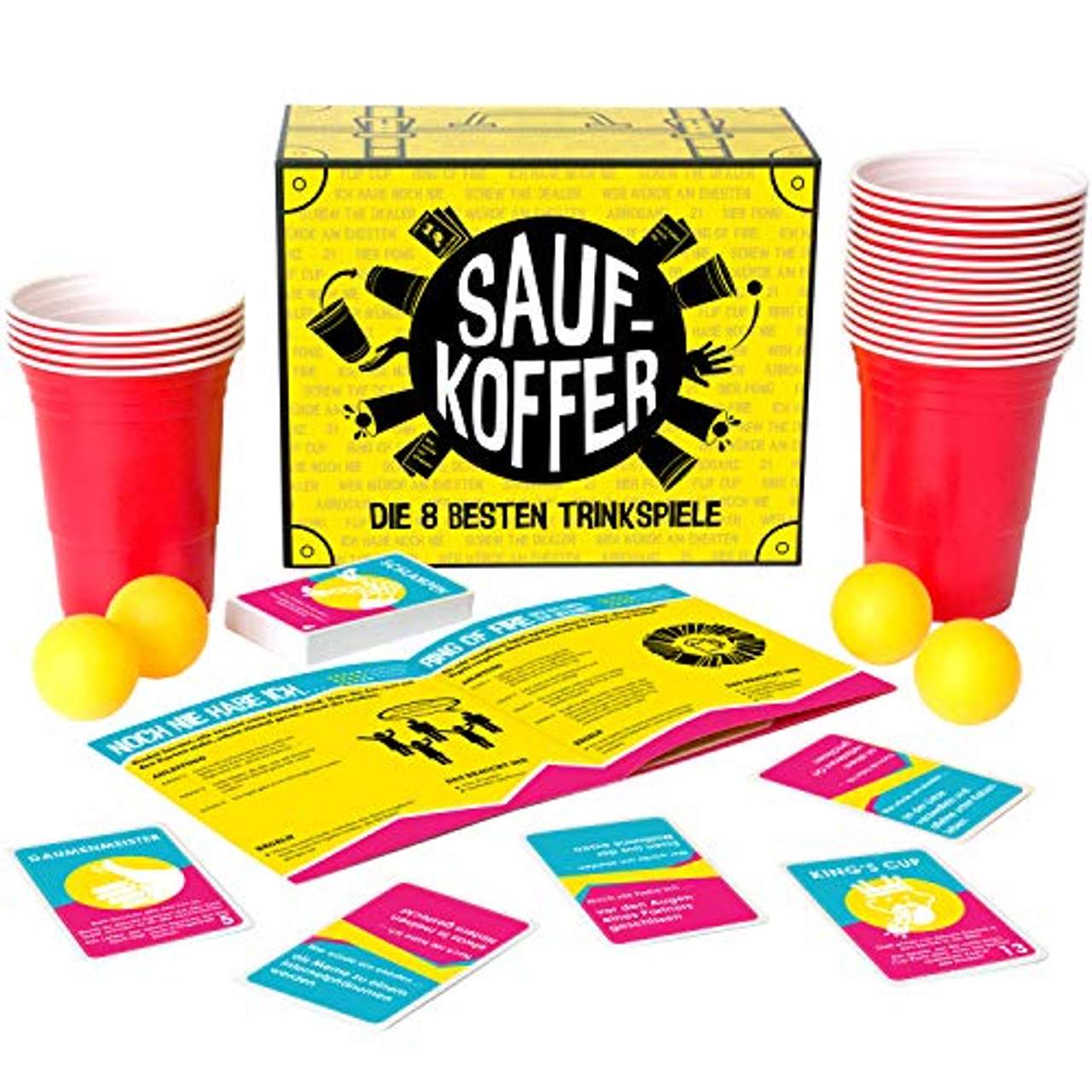 Gutter Games SaufkofferSaufkoffer bringt Schwung in jede Party und enthält alles, was ihr braucht, um die 8 besten Trinkspiele aller Zeiten zu spielen. Ihr müsst lediglich Freunde und Alk beschaffen! Bewährte Party-Kracher wie Bierpong, Ring of Fire, Noch nie habe ich und Flip Cup heizen der Party bis zum Morgengrauen ein. Aber keine Panik, es bleiben reichlich Partyspiele für das nächste Wochenende übrig.8 TRINKSPIELE IN EINEM: - Bier Pong Auf die Bälle, fertig, los! - Ring of Fire (aka Kings Cup) Ein echt versoffenes Spiel. - Noch nie habe ich Findet heraus, wie versaut eure Freunde wirklich sind. - Wer würde am ehesten Dieses fiese Spiel bringt eure dunkle Seite zum Vorschein. - Flip Cup Wunderbar einfach, unverschämt lustig. - 21 Bis 21 zählen sollte simpel sein ist es aber nicht! - Arroganz Und der Preis für den arrogantesten Säufer geht an - Screw The Dealer Rasantes Ratespiel mit feuchtfröhlichem Finale. BRINGT JEDE PARTY IN SCHWUNG: Acht lustige Partyspiele für den Preis von einem was will man mehr? Saufkoffer ist ein tolles Geschenk für Studenten, zum Geburtstag, zu Weihnachten, als Wichtelgeschenk oder für Junggesellinnen- und Junggesellenpartys.Dank seiner kompakten Größe passt es in Handtaschen und Rucksäcke, so dass ihr es einfach zur nächsten Hausparty, zum Vorglühen oder zum Festival mitnehmen könnt. EINFACHE REGELN, SCHRITT FÜR SCHRITT: Die Zeit der endlosen Diskussionen über die Ring of Fire-Regeln ist vorbei!Saufkoffer enthält ein Regelheft mit einfachen Schritt-für-Schritt-Anleitungen und Bildern. Dazu kommt eine praktische Einstufung nach Komik-Faktor, Einfachheit und Saufpegel, so dass ihr für jeden Anlass das passende Trinkspiel wählen könnt. Enthält stundenlangen Lachspaß, versoffene Albernheiten sowie Kopfweh und Kater.Falls ihr es genau wissen wollt: - 20 Rote Bier Pong-Becher abwaschbar, wiederverwendbar, sehen aus wie das amerikanische Original - 4 Tischtennisbälle - Saufkoffer-Kartenspiel mit Noch nie habe ich, Wer würde am ehesten … und Ring of Fire-Karten - Regelheft