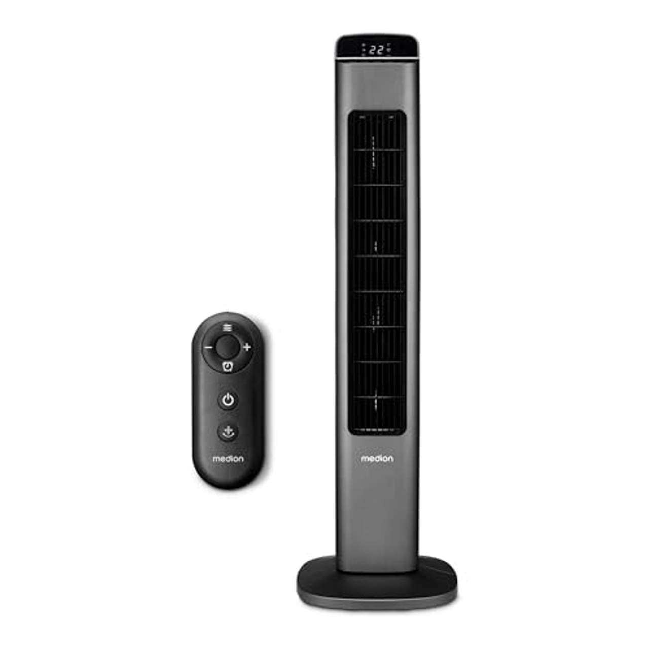 MEDION P15 TF Turmventilator mit FernbedienungTurmventilator mit Fernbedienung, 45 Watt Leistung, Oszillationskfunktion, 5 Geschwindigkeitsstufen und Timer-Funktion|Betriebsmodi: Sie entscheiden flexibel, wie der Ventilator arbeiten soll. 5 Geschwindigkeitsstufen und eine Timer-Funktion (bis zu 24 Stunden) stehen zur Wahl|Fernbedienung: Mit der beiliegenden Fernbedienung steuern Sie sämtliche wichtigen Funktionen ganz komfortabel, ohne dafür aufstehen zu müssen|Einfach stark: Durch die schmale Konstruktion, den starken 45-Watt-Motor und die 80° Oszillation genießen Sie eine besonders effiziente Kühlung|Lieferumfang: Turmventilator MD 10809, Fernbedienung inkl. Batterien (CR2025), Bedienungsanleitung und Garantiekarte