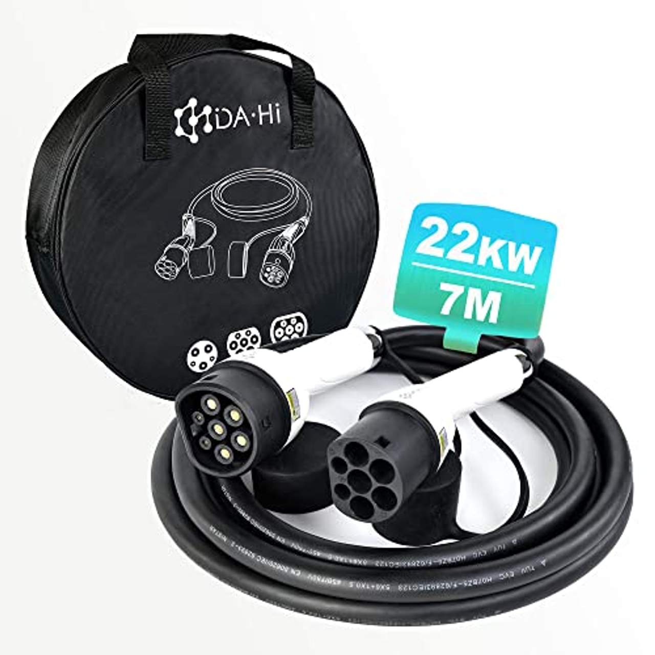 EV Ladekabel Typ 2 22KW 7m 32A 3 phasigDer ‚DA·Hi‘ Typ 2 EV Ladekabel in bester Qualität verfügt über eine hervorragende Ladegeschwindigkeit und ist mit allen Elektrofahrzeugen Elektroautos und Hybriden des Typs 2 (IEC 62196-2) kompatibel, unterstützt 1. Ladevorgängen bis zu 7.4 kW und Stromstärke bis zu 32 A und (1-Phasig) 2. Ladevorgängen bis zu 3.7 kW und Stromstärke bis zu 16 A und (1-Phasig) 3. Ladevorgängen bis zu 11 kW und Stromstärke bis zu 16 A und (1-Phasig, 2-phasig oder 3-phasig). 4. Ladevorgängen bis zu 22 kW und Ladevorgängenbis zu 32A und (1-Phasig, 2-phasig oder 3-phasig). BITTE BEACHTEN SIE: Die maximal realisierbare AC-Ladeleistung hängt auch von dem OBC (On-Board Charger) des Elektrofahrzeugs ab, da unterschiedliches OBC unterschiedliche maximale AC-Ladeleistung bietet.Produktmerkmale Betriebsspannung Stromstärke Max AC-Ladeleistung 1 Phase 16 A 3.7 kW 1 Phase 32 A 7.4 kW 3 Phase 16 A 11 kW 3 Phase 32 A 22 kW Mechanische Lebensdauer: Leerlauf Einstecken / Herausziehen: 10000-fach Betriebstemperatur: -40 ° C ~ +, 85 ° C Schutzgrad: IP54 (Betriebszustand) Material: Gehäusematerial: Thermoplast, flammhemmend PC9330-Material Kontakt bush: Kupferlegierung, Versilberung Anwendungstipps: 1. Auto entriegeln, Ladeklappe öffnen 2. Stecker ins Auto 3.1 (evtl. Ladesäule / Wallbox freischalten) 3.2 Stecker in die Säule / Wallbox PS: Bitte den Motor ausschalten und den Schalthebel auf Position «P» stehen, bevor den Ladevorgang starten. Hinweis: Das Kabel kann nicht als Verlängerungskabel verwendet werden.