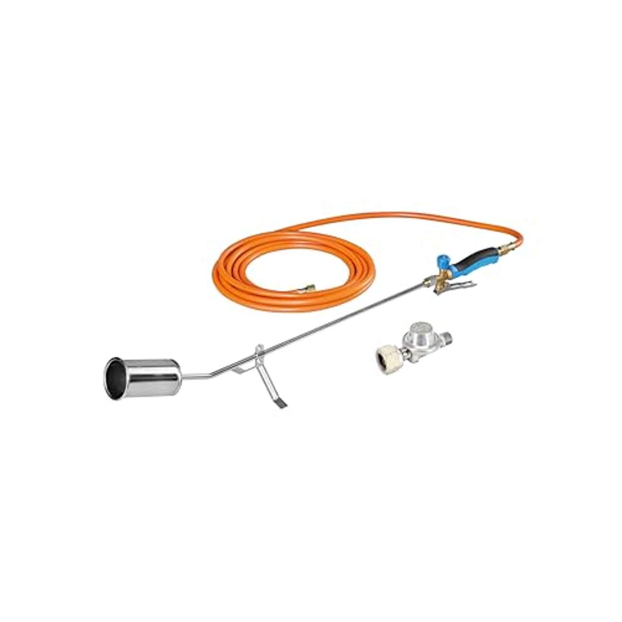 Das CFH Abflammgerät GV 900 52084 ist ein Unkrautbrenner, der vielseitig einsetzbar ist, z. B. zum Entfernen von Unkraut, zum Trocknen von Beton, zum Schweißen von Teichfolien und Dachisolierungen, zum Auftauen von Fallrohren und Dachrinnen und zum Befreien von Gehwegen von Eis. Er wird mit einem 5 m langen Schlauch und einem Ablageständer geliefert. Zum Starten des Geräts ist ein Propandruckregler (nicht im Lieferumfang enthalten) erforderlich. Es sind vier Arten von Druckreglern erhältlich: Regler mit konstantem Druck, Regler mit einstellbarem Druck und jeweils zwei Versionen. Für den kommerziellen Einsatz kann zusätzlich eine Schlauchbruchsicherung erforderlich sein.