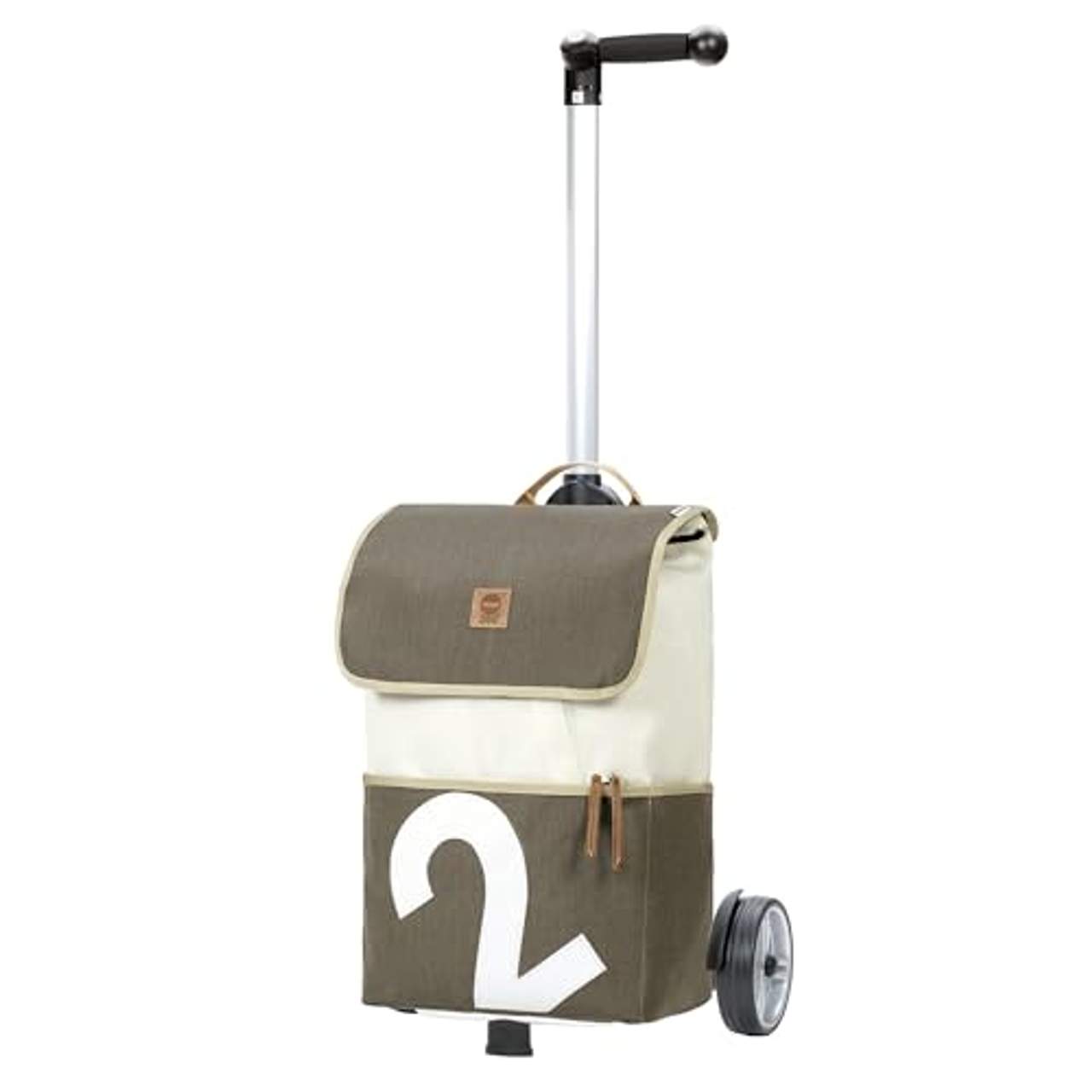 Andersen Shopper Unus und 51 Liter Tasche 360° Mole 2 grauAndersen SHOPPER MANUFAKTUR Einkaufstrolley mit viel PlatzDaten Einkaufstrolley:Maße außen: Breite ca. 49 cm, Höhe ca. 126 cm, Tiefe ca. 43 cmMaße innen: Breite ca. 30 cm, Höhe ca. 59 cm, Tiefe ca. 22 cmGewicht: ca. 3100 gEinzelgewicht Tasche:ca. 800 gFahrgestelltragkraft: ca. 40 kgVolumen: ca. 50 lFarbe: Mole2 (grau / weiß / beige)1 Tragegriff verstärkt: ca. 27 cm1 Tragegriff: ca. 31 cmMaterial: 100% CanvasNachhaltige Bestandteile: recyceltes SegeltuchLieferumfang: Andersen SHOPPER MANUFAKTUR Einkaufstrolley mit Etikett, 1 x BodenplatteAusstattung Einkaufstrolley:Einkaufstrolley wird mit Überschlagklappe, verdecktem Klettverschluss und Zugband geschlossenIm Hauptfach 1 ZipperfachAuf der Vorderseite 1 verdecktes Zipperfach mit Two Way ZipperAuf der rechten und linken Seite 1 verdecktes ZipperfachAuf der Rückseite 2 Trolleyhalterungen mit stufenlos verstellbarer Schnalle und KlettverschlussMit fester Bodenplatte, leisen Rollen und Schutzfüßchen ausgestattetMit höhenverstellbarem Griff, 3-Wege-System Griff, faltbarem Fußgestell und HängFix ausgestattetIst wasserabweisendBesitzt geräumiges HauptfachIst standfestIst kompatibel für separate FahrradbefestigungBesitzt eine leicht abnehmbare TascheBesitzt 2 RollenDas Andersen SHOPPER MANUFAKTUR Logo ist gut sichtbar eingearbeitetAndersen SHOPPER MANUFAKTUR Unus Shopper 360° 50L - Ein Einkaufstrolley aus recyceltem MaterialNachhaltig, praktisch und stylisch. Das alles bietet Andersen SHOPPER MANUFAKTUR mit diesem hochwertigen Einkaufstrolley. Der Artikel ist eine optimale Transporthilfe und schleppt das Gepäck oder Ihren Einkauf für Sie. Ausgestattet mit extra großen Rädern und einer Vorrichtung für eine Fahrradhalterung, die nicht im Lieferumfang enthalten ist.Schnell und einfach kann der Einkaufstrolley zusammengefaltet werden. Dieses Modell kann mit dank des HängFix am Einkaufswagen eingehängt werden. Dieses befindet sich an der Rückseite des Gestells. Der Andersen SHOPPER MANUFAKTUR Unus Shopper 360° 50L ist aus einem recyceltem Segeltuch hergestellt, was eine besondere Optik vermittelt.