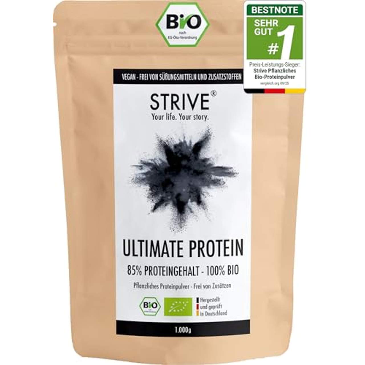 Ultimate Protein 100% BIO Vegan ist ein veganes Bio-Proteinpulver der Marke STRIVE. Es hat einen Proteingehalt von 80%, bietet ein ausgewogenes Aminosäureprofil und enthält wertvolle Mineralien wie Magnesium, Eisen und Phosphor. Das Produkt ist sojafrei, glutenfrei und frei von jeglichen Zusatzstoffen, um eine maximale Wirksamkeit zu gewährleisten. Außerdem wird es in Deutschland unter strengen Qualitätsstandards und mit klimafreundlichen Praktiken wie der Pflanzung eines Baumes pro Dose hergestellt.