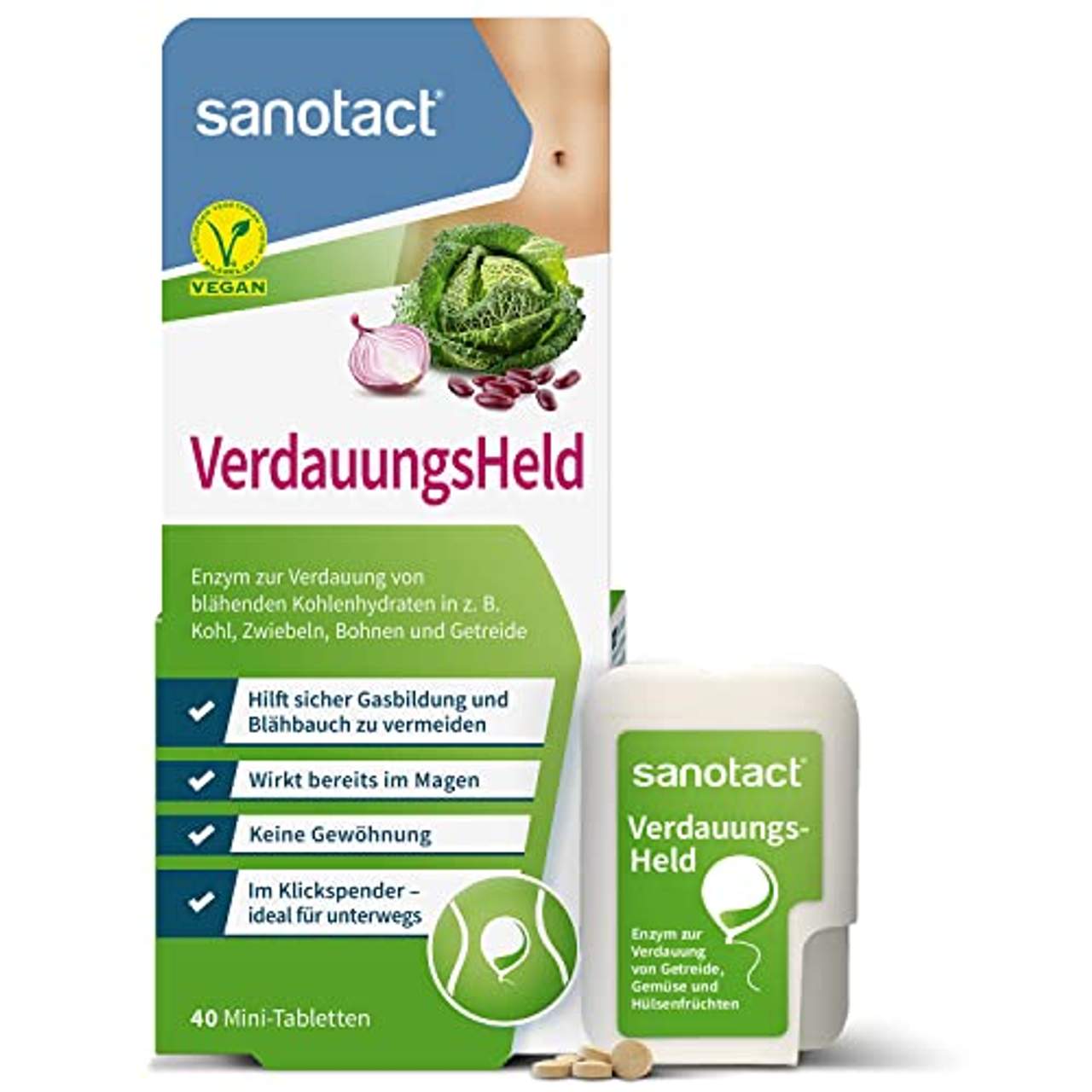 sanotact VerdauungsHeld 40 Mini-TablettenHilft sofort Gasbildung und Blähbauch zu vermeiden Enzym zur Verdauung von Kohlenhydraten in Getreide, Gemüse und Hülsenfrüchten. Hilft Gasbildung und Blähungen zu vermeiden. Somit kein Blähbauch und Bauchschmerzen. Sehr viele Menschen können die in zahlreichen Lebensmitteln (z.B. Kohlarten, Vollkornprodukten und einigen Obstsorten) enthaltenen mittelkettigen Kohlenhydrate, auch Oligosaccharide genannt, nur unzureichend oder gar nicht verdauen. Sanotact VerdauungsHeld Mini-Tabs führen das für die leichtere Verwertung der Oligosaccharide notwendige Enzym Alpha-Galactosidase zu, so dass die typischen Verdauungsbeschwerden wie Blähungen oder Bauchschmerzen vermieden werden können.