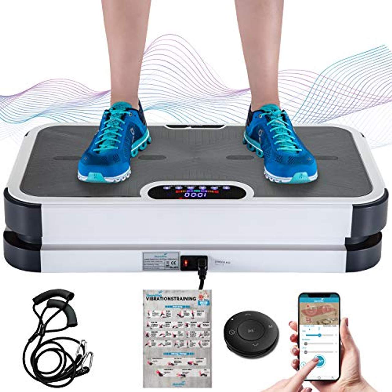 Die Vibrationsplatte verfügt über viele erstklassige Funktionen, die sie von ähnlichen Produkten auf dem Markt abhebt. Dazu gehören ein Touch-Display, eine ClipOn-Fernbedienung, eingebaute Bluetooth-Lautsprecher und zusätzliche Trainingsbänder, mit denen der ganze Körper trainiert werden kann.