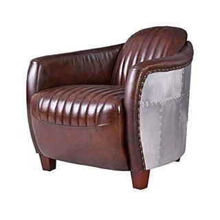Zusammenfassend lässt sich sagen, dass der Vintage Sessel Aviator Clubsessel Leder & Metall Loungesessel ein sorgfältig gefertigter Sessel ist, der Elemente des Industrie- und Fabrikdesigns verkörpert. Mit seiner robusten Lederkonstruktion, den handgefertigten Details und den dekorativen Metallplatten, die von der Ästhetik der Luftfahrt inspiriert sind, bietet dieser Sessel sowohl Haltbarkeit als auch Raffinesse. Seine komfortablen Abmessungen und sein Vintage-Charme machen ihn zu einer vielseitigen Ergänzung für jeden Raum, perfekt für alle, die ein einzigartiges und zeitloses Möbelstück suchen.