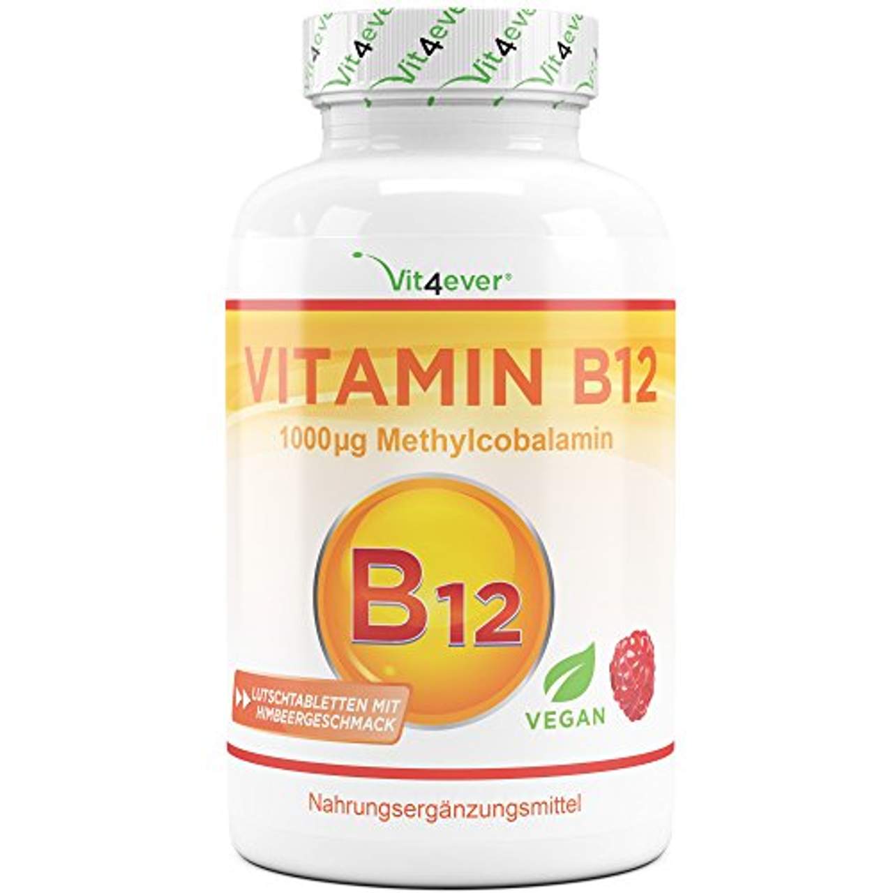 Vit4ever Vitamin B12 VeganVit4ever Vitamin B12 Das Vitamin B12 ist ein essentielles und wasserlösliches Vitamin, welches für zahlreiche wichtige Funktionen im Körper benötigt wird. Neben den allseits bekannten Vitaminen kann man behaupten, dass das Vitamin B12 eine gewisse Sonderstellung einnimmt.Der Grund hierfür ist, dass unter allen Vitaminen das Vitamin B12 sowohl das größte als auch das komplexeste Vitamin ist und als einziges Vitamin das metallische Element Cobalt enthält, welches dem Vitamin auch seinen Namen Cobalamin gibt.Vitamin B12 muss über die Nahrung aufgenommen werden, ist jedoch nur in Lebensmitteln tierischen Ursprungs enthalten, was auch einer der Gründe für einen weit verbreiteten Mangel an Vitamin B12 ist. Besonders Veganer und Vegetarier haben es hier schwer hochdosiertes Vitamin B12 oder veganes Vitamin B12 in ausreichender Menge zu sich zu nehmen.Ein Mangel an Vitamin B12 kann schwerwiegende gesundheitliche Folgen haben, jedoch können Nahrungsergänzungsmittel mit Vitamin B12 Methylcobalamin einem solchen Mangel entgegenwirken und körpereigene Stoffwechselprozesse wohltuend unterstützen. Die Vit4ever Lutschtabletten sorgen hier für eine besonders hohe Bioverfügbarkeit da die Form der sublingualen Einnahme über die Schleimhäute im Mund erfolgt und ein Wirkungsverlust der herkömmlichen Einnahme über die Schleimhäute des Darms umgangen werden kann.Unser Vitamin B12 1000 mcg wird nach europäischen Qualitätsstandards (DIN EN ISO 9001 und HACCP-Konzept) hergestellt und wie bei allen Nahrungsergänzungsmitteln von Vit4ever, legen wir stets großen Wert darauf, dass bei der Produktion ausschließlich natürliche Premium Rohstoffe verwendet werden.Highlights auf einen Blick: In jeder Dose befinden sich 365 vegane Vitamin B12 Tabletten. Hochdosiert mit 500 µg Vitamin B12 pro halber Tablette. Nehmen Sie jeden zweiten Tag 1 Tablette zu sich ein. Dies entspricht einer täglichen Verzehrmenge von Vitamin B12 500&mu g (20.000% NRV). Sie können die Tablette lutschen oder kauen. Die Vitamin B12 Tabletten mit Himbeere Geschmack können gelutscht, gekaut oder alternativ geschluckt werden. Durch die Verwendung von Methylcobalamin & der sublingualen Einnahme über die Schleimhäute im Mund, wird der Wirkstoff vom Körper besser absorbiert. Unsere Vitamin B12 Tabletten sind für Veganer und Vegetarier geeignet, da wir keine tierischen Zutaten verwenden. Das enthaltene Vitamin B12 wird durch pflanzliche Fermentation hergestellt und ist somit zu 100% vegan.Die Kapseln sind frei von Magnesiumstearat, Farbstoffen, Stabilisatoren, Gelatine und selbstverständlich auch GMO-frei, laktosefrei, glutenfrei & ohne Konservierungsstoffe. Was bewirkt Vitamin B12? Vitamin B12 ist an vielen Stoffwechselprozessen beteiligt. Es trägt zu einem normalen Energiestoffwechsel bei und unterstützt die körpereigene Abwehr indem es die Funktion des Immunsystems unterstützt. Darüber hinaus wird eine normale Funktion des Nervensystems beibehalten und somit zur Verringerung von Müdigkeit und Ermüdung beigetragen.Weiterhin schützt das Vitamin das Herz-Kreislauf-System vor Homocystein und trägt zu einer normalen Bildung roter Blutkörperchen bei. Vit4ever Qualität Unsere hochwertigen Vitamin B12 Tabletten sind 100 % vegan und frei von unerwünschten Zusatzstoffen wie z.B. Magnesiumstearat und gentechnikveränderten Zutaten (GMO frei). Zusätzlich wurden unsere Vitamin B12 Tabletten unabhängig laborgeprüft auf Ihren Wirkstoffgehalt und weitere relevante Prüftkritieren wie zb. Schwermetalle, Schimmelpilze, E. Coli, & Salmonellen.