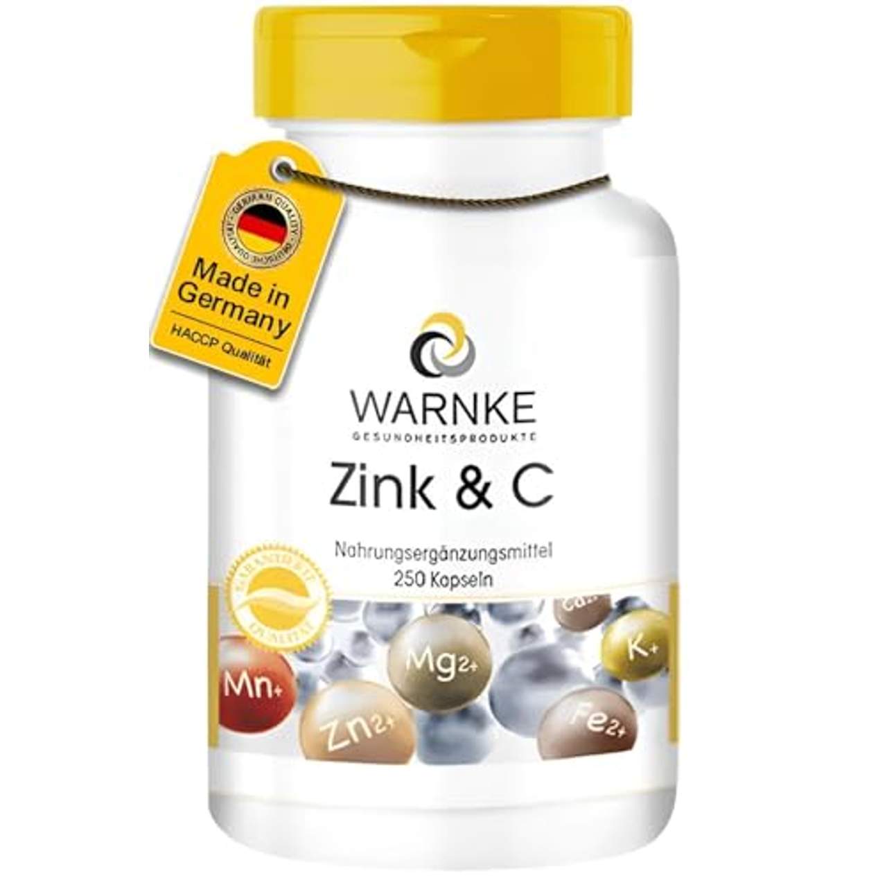 WARNKE VITALSTOFFE ZinkPZN: 03863606 Zink und C 250 Kapseln Nahrungsergäzungsmittel zur Unterstützung des Immunsystems mit Zink und Vitamin C Verzehrempfehlung Erwachsene nehmen täglich 1 Kapsel mit viel Wasser ein. Zutaten L-Ascorbinsäure (60%), Trennmittel mikrokristalline Cellulose, Überzugsmittel Hydroxypropylmethylcellulose (Kapselhülle), Zinksulfat (5%), Trennmittel Magnesiumsalze der Speisefettsäuren Quelle: Warnke Gesundheitsprodukte GmbH & Co KG Nettofüllmenge 130,00 g/