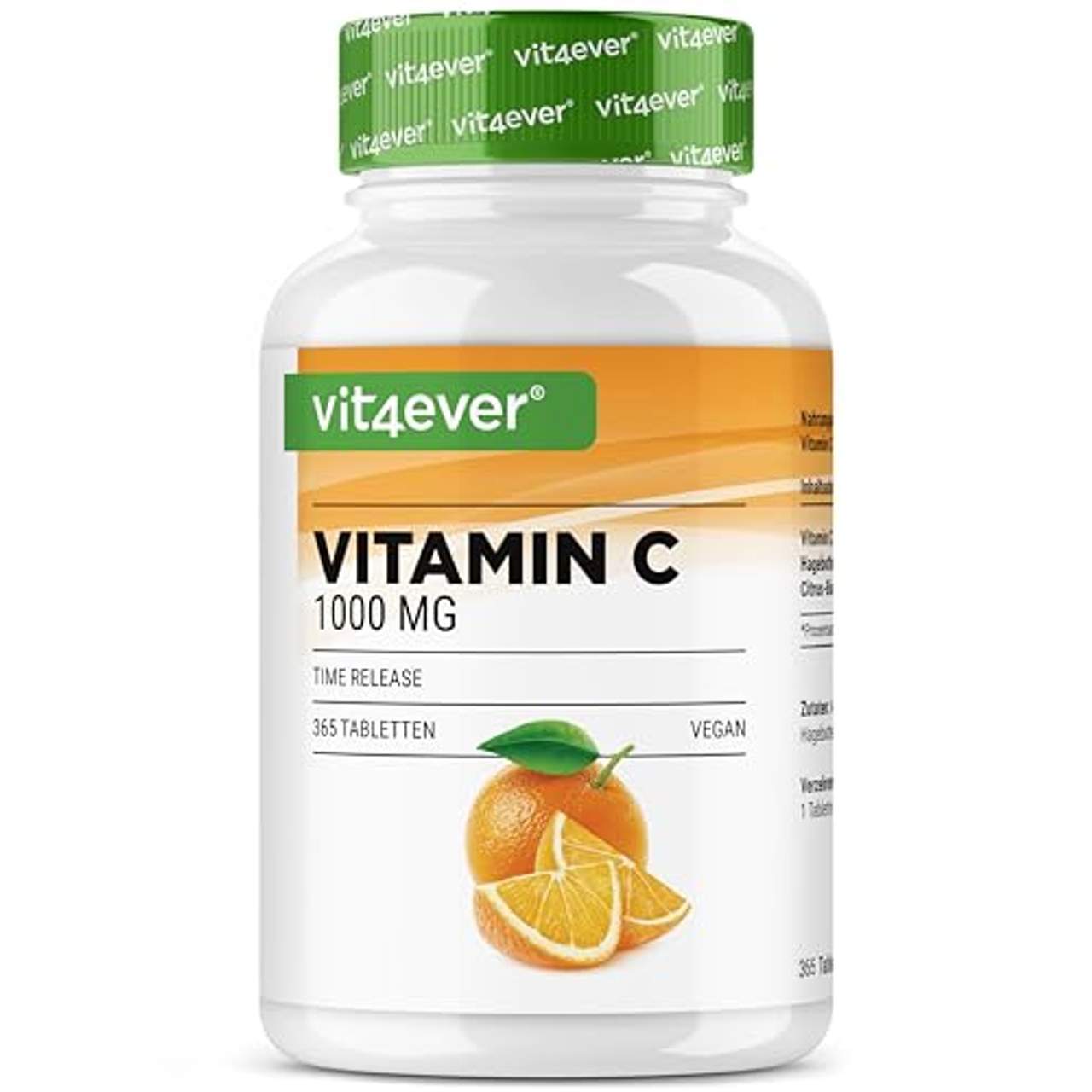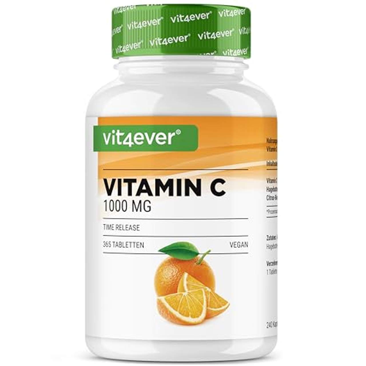 Vit4ever Vitamin C 1000mgVitamin C Tabletten im Detail Vitamin C, auch Ascorbinsäure genannt, gehört zu den wasserlöslichen Vitaminen. Dadurch kann es vom Körper nicht gespeichert werden. Da dieser auch nicht in der Lage ist, Vitamin C selber herzustellen, ist der menschliche Organismus auf eine regelmäßige Zufuhr angewiesen. Vitamin C Wirkung Im Folgenden sind die von der Europäischen Behörde für Lebensmittelsicherheit (EFSA &ndash European food safety authority) als gesichert angesehenen Wirkungen von Vitamin C für den Menschen aufgeführt. Functional claims (Gesundheitsbezogene Angaben) Vitamin C trägt zur Verringerung von Müdigkeit und Ermüdung bei trägt zur normalen psychischen Funktion bei trägt zur Regeneration der reduzierten Form von Vitamin E bei trägt zu einem normalen Energiestoffwechsel bei trägt zu einer normalen Funktion des Immunsystems (körperliche Abwehr) bei trägt zu einer normalen Funktion des Nervensystems bei trägt dazu bei, die Zellen vor oxidativem Stress zu schützen trägt zu einer normalen Funktion des Immunsystems (körperliche Abwehr) während und nach intensiver körperlicher Betätigung zu erhalten Highlights auf einen Blick:365 hochdosierte Tabletten im praktischen 12 Monatsvorrat. Jede TABLETTE enthält 1000 mg Vitamin C + 20 mg Hagebuttenextrakt + 20 mg Citrus-Bioflavonoidenlavonoiden Die Vitamin C Tabletten enthalten zusätzlich Citrus-Bioflavonoiden & Hagebuttenextrakt, welches die Bioverfügbarkeit des Vitamin C verstärkt. Durch den zusätzlichen Time Released Effekt (zeitverzögerte Abgabe an den Körper) wird das Vitamin C langsam an den Körper abgegeben Vitamin C trägt dazu bei die Zellen vor oxidativem Stress zu schützen und die Müdigkeit zu verringern. Außerdem trägt es zur normalen Funktion des Energiestoffwechsels, des Immunsystem und des Nervensystems bei Unsere Vitamin C Tabletten sind zu 100% vegan & frei Gelatine, Aromen, Farbstoffen, Stabilisatoren, Konservierungsstoffen und selbstverständlich laktosefrei & glutenfrei Vit4ever Vitamin C Highlights Vitamin C von Vit4ever enthält 1000 mg hochdosiertes Vitamin C pro Tablette. Durch die XXL Vorratspackung mit 365 Tabletten reicht eine Dose für ein ganzes Jahr bei der Einnahme von 1 Tablette täglich. Durch eine besondere Tablettenentwicklung, welche die Freisetzung des Vitamin C verlangsamt, wird der Körper über mehrere Stunden mit Vitamin C versorgt (Zeitverzögerte Abgabe - Time Released Effekt).Zudem ist das Vitamin C von Vit4ever mit Hagenuttenextrakt und zusätzlichen Citrus- Bioflavonoiden angreichert, wodurch die Bioverfügbarkeit des enthalten Vitamin C erhöht werden kann. Des weiteren können die enthalten Bioflavonoide das Vitamin C vor Oxidation schützen, dadurch liegt das enthaltene Vitamin C in einer sehr stabilen Verbindung vor. Verzehrempfehlung & Produktqualität Aufgrund der hochdosierten Zutaten, werden 22 x 9 mm große Tabletten verwendet. Gemäß Verzehrempfehlung wird empfohlen eine Tablette täglich mit ausreichend Flüssigkeit zu verzehren. Die Vitamin C Tabletten werden nach europäischen Qualitätsstandards (DIN EN ISO 9001 und HACCP-Konzept) hergestellt und wie bei allen Nahrungsergänzungsmitteln von Vit4ever, legen wir stets großen Wert darauf, dass bei der Produktion ausschließlich Premium Rohstoffeverwendet werden. Die hochdosierten Vitamin C Tabletten sind natürlich 100 % vegan und frei von Gelatine, Aromen, Farbstoffen, Stabilisatoren und gentechnikveränderten Zutaten (GMO frei).