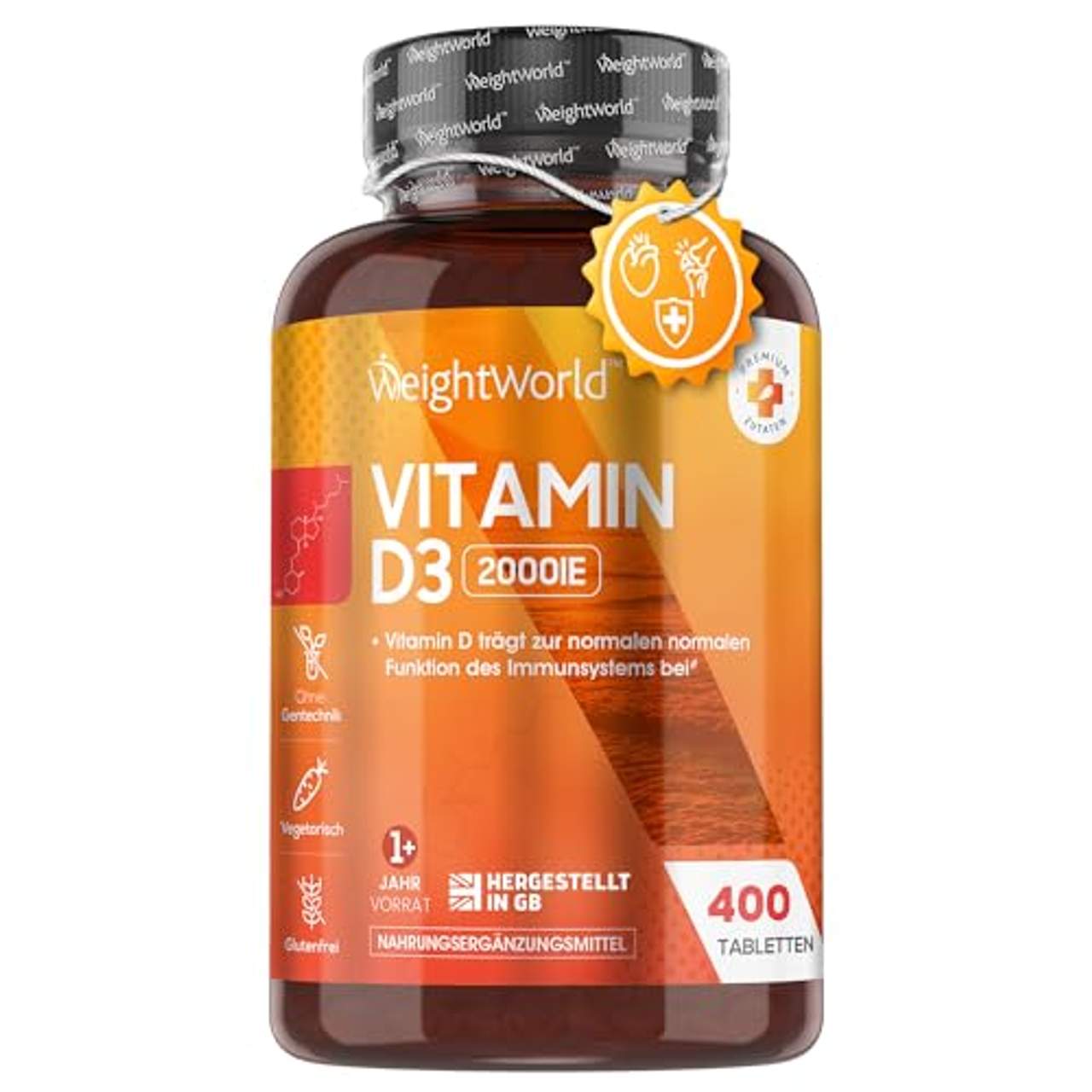 WeightWorld Vitamin D3 TablettenErhalten Sie Ihre tägliche Dosis Vitamin D3 - Vitamin D ist als Sonnenvitamin bekannt und unterstützt den ganzen Körper. Eine Vitamin D Tablette enthält 2000 I.E. Cholecalciferol. Die empfohlene Tagesdosis für Deutschland ist 1000 I.E., somit benötigen Sie 1 Tablette alle 2 Tage. Sie sind besonders klein und dadurch leicht zu schlucken. Mit 400 Tabletten pro Packung haben sie einen besonders langen Vorrat von mehr als 2 Jahren. Vorteile von WeightWorld Vitamin D3 - Laut EFSA trägt Vitamin D zur Verringerung des Sturzrisikos bei, das mit Haltungsinstabilität und Muskelschwäche einhergeht. Stürze sind ein Risikofaktor für Knochenbrüche bei Männern und Frauen im Alter von 60 Jahren und älter. Es trägt auch zu einer normalen Aufnahme von Kalzium und Phosphor bei.Es trägt auch zu einer normalen Funktion des Immunsystems bei. Vitamin D spielt eine Rolle im Prozess der Zellteilung. Vitamin D3 Cholecalciferol - Laut EFSA trägt Vitamin D zur Erhaltung normaler Knochen, Muskelfunktionen und Zähne bei. Vitamin D wird vom Körper auf natürliche Weise als Reaktion auf Sonnenlicht gebildet und ist in bestimmten Nahrungsmitteln wie fettem Fisch und Eiern enthalten. Es kann jedoch schwierig sein, die erforderliche Tagesdosis allein durch Sonnenlicht und Nahrung zu erhalten.Unsere Tabletten erhöhen Ihren Vitamin D Spiegel und unterstützen Ihre allgemeine Gesundheit. Vegetarisch & nachhaltige Verpackung - Unsere Nahrungsergänzungsmittel sind rein für Vegetarier geeignet & frei von Gluten, Laktose, Aromen, Farbstoffen, Allergenen und selbstverständlich ohne Gentechnik und Tierversuche hergestellt. Unsere Produkte sind klimafreundlich und wir nutzen wiederverwendbare Verpackungen, um so unsere CO2-Emissionen zu reduzieren. Außerdem werden sie gemäß GMP Standards unter strengen europäischen Richtlinien hergestellt.