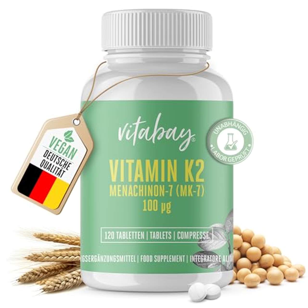 Vitabay Vitamin K2 100 mcgVITAMIN K2 100 μg MK-7 vegan Tabletten Nahrungsergänzungsmittel mit Vitamin K2 Reine Vitamin K Formel Gewonnen aus dem japanischen Lebensmittel Natto Cis-Anteil von 0% 100 μg Vitamin K2 Vitamin K trägt zur Erhaltung normaler Knochen bei Vitamin K trägt zu einer normalen Blutgerinnung bei Gluten- und lactosefrei Vegan