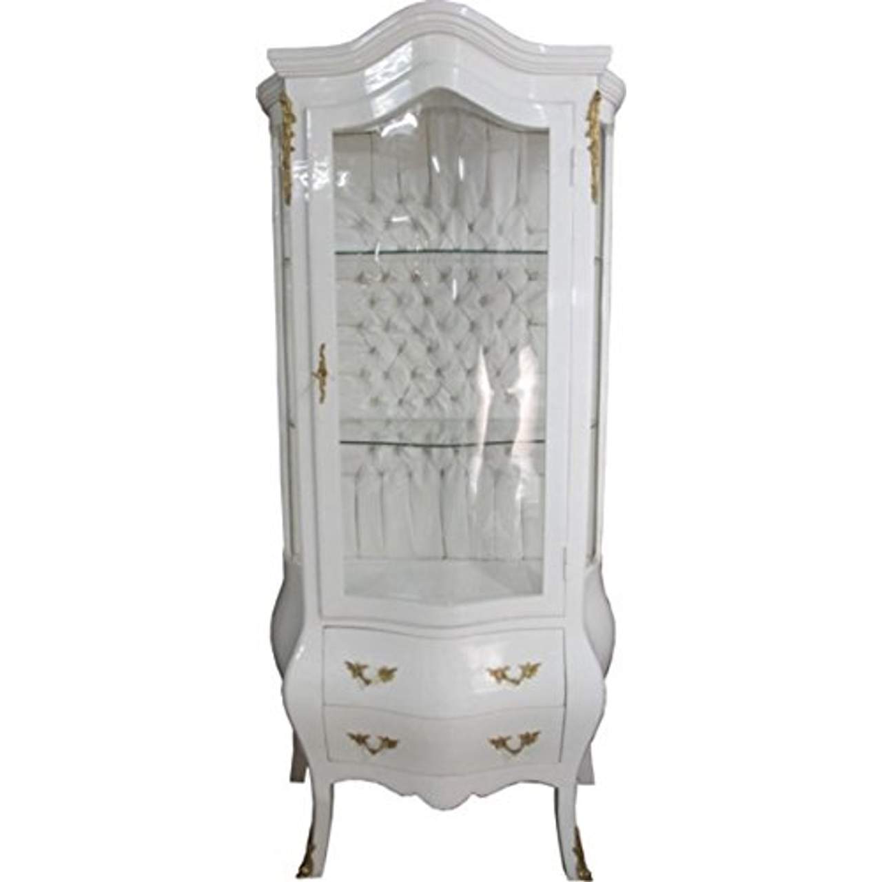 Casa Padrino Barock Glasvitrine WeißCasa Padrino Barock Glasvitrine Weiß / Gold - Vitrinen Schrank Höhe ca 185 cmBeite ca 85 cmTiefe ca 50 cm MassivholzWeiß / Gold Dieser Artikel ist eine authentisch handgefertigte Replik im antiken Stil. Farbabweichungen, kleine Risse, Abplatzer, Antikspuren, Beulen und andere antike Stilmerkmale sind Bestandteil des Artikels und machen jedes Möbelstück zu einem Unikat.