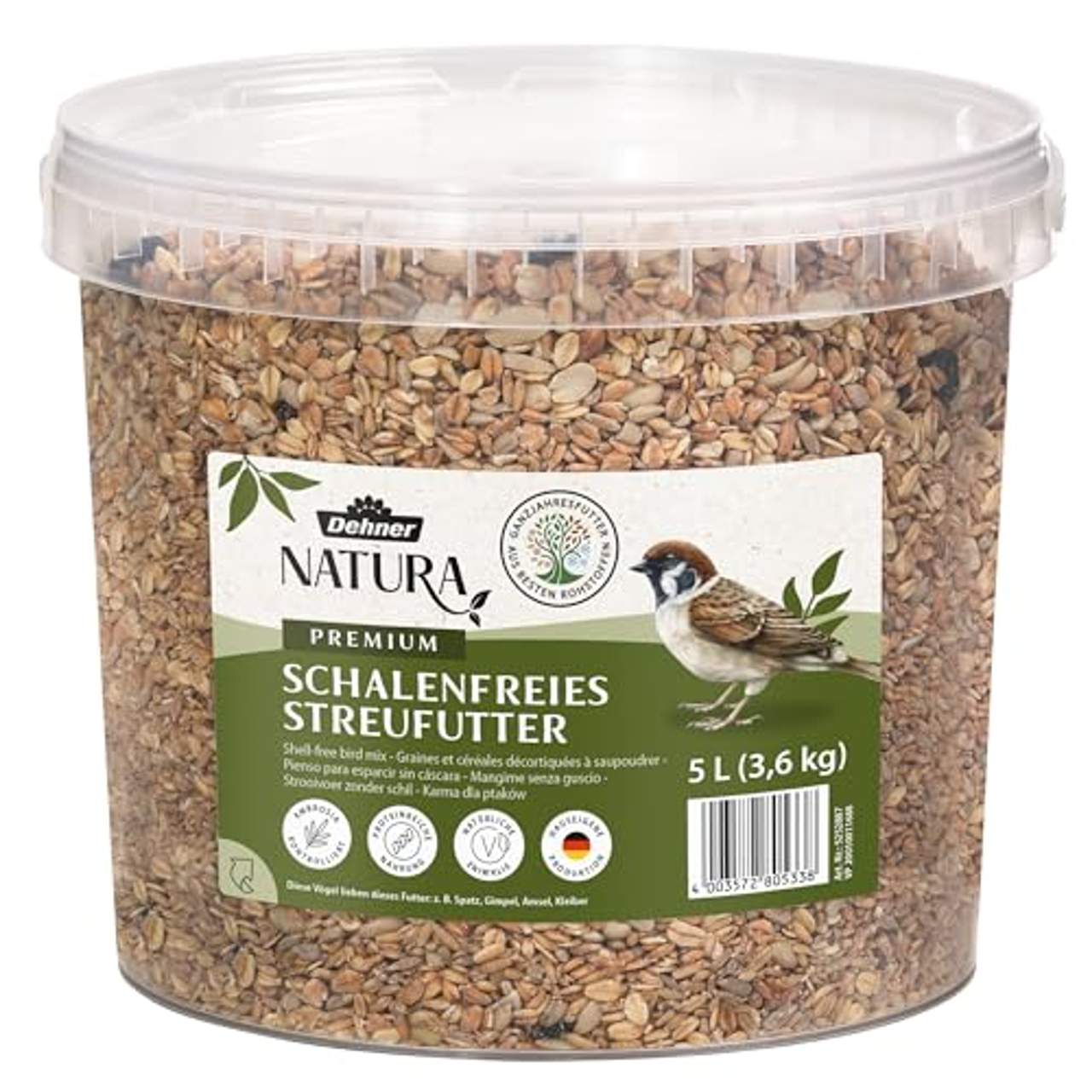 Dehner Natura Wildvogelfutter schalenfreies StreufutterHochwertige und energiereiche Futtermischung, ideales Ganzjahresfutter Keine Schalenrückstände, deshalb ideal für Balkon und Terrasse Für alle Körner- und Weichfutterfresser wie z.B. Kohlmeise, Gimpel etc. Wichtiger Energielieferant durch fetthaltige Erdnuss und pflanzliches Öl Durch weiche Bestandteile ideal auch für Jungtiere geeignet Ein köstliches Körner-Menü, das Wildvögel magisch anzieht:Dehner Natura Streufutter schalenfrei schmeckt das ganze Jahr Hochwertiges Wildvogelfutter, energiereich, mit vielen Vitaminen Sie haben Ihre Terrasse mit viel Liebe zu einem üppig grünenden und reich blühenden Stückchen Natur gemacht und genießen jede Minute, die Sie dort verbringen können.Dabei haben Sie Ihre gefiederten Gäste ganz besonders ins Herz geschlossen. Denn dank Dehner Natura Streufutter schalenfrei sind Sie schnell zum echten Publikumsmagnet der Wildvogelwelt geworden. Sie können Dehner Natura Streufutter schalenfrei das gesamte Jahr über füttern und sich so auch im Sommer über
