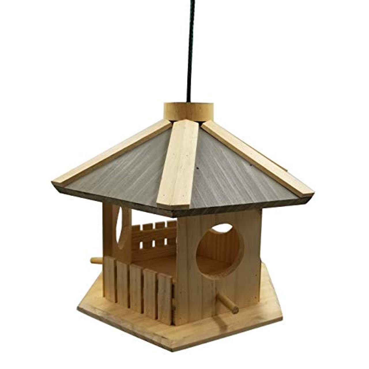 - Schützendes Dach: Das Vogelhaus verfügt über ein schützendes Dach mit verstärkenden Kiefernholzelementen, das zusätzlichen Schutz vor den Elementen bietet und den Vögeln einen sicheren Platz zum Ausruhen und Füttern bietet.