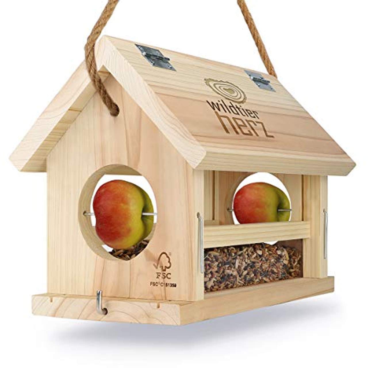 wildtier herz I Vogelfutterhaus M Handarbeit aus Natur-HolzBrand: wildtier herz Features: VIELSEITIG & LANGLEBIG: Das Vogelfutterhaus ist komplett aus Natur-Holz hergestellt somit absolut wetterfest und extrem langlebig. Es besteht aus einer großen Plattform für Vogelfutter, zwei Apfel-Haltern und einem Meisenknödelhalter. Maße: 30cm x 23.5cm x 20cm ARTENSCHUTZPRODUKT: Das Vogelfutterhaus zum Aufhängen eignet sich für die Ganzjahresfütterung im Garten oder auf dem Balkon. Ein artgerechtes Vogelhaus für Meisen, Rotkehlchen, Spatzen & Co. Von Biologen und Artenschützern entwickelt und empfohlen. GANZJÄHRIGE FÜTTERUNG: Die Vogelfutterstation aus verschraubten Massiv-Holz Elementen ermöglicht eine abwechslungsreiche und artgerechte Vogelfütterung mit Meisenknödel, Äpfeln und Vogelfutter NACHHALTIGE WALDWIRTSCHAFT: Die wildtierherz Vogelhäuser sind aus 100 unbehandelten FSC Holz mit verschraubten Holz-Elementen hergestellt.Ein artgerechtes Naturschutz-Produkt. INKLUSIVE RATGEBER & FUTTERTIPPS: Zu jedem Vogelhaus ist eine Anleitung mit wertvollen