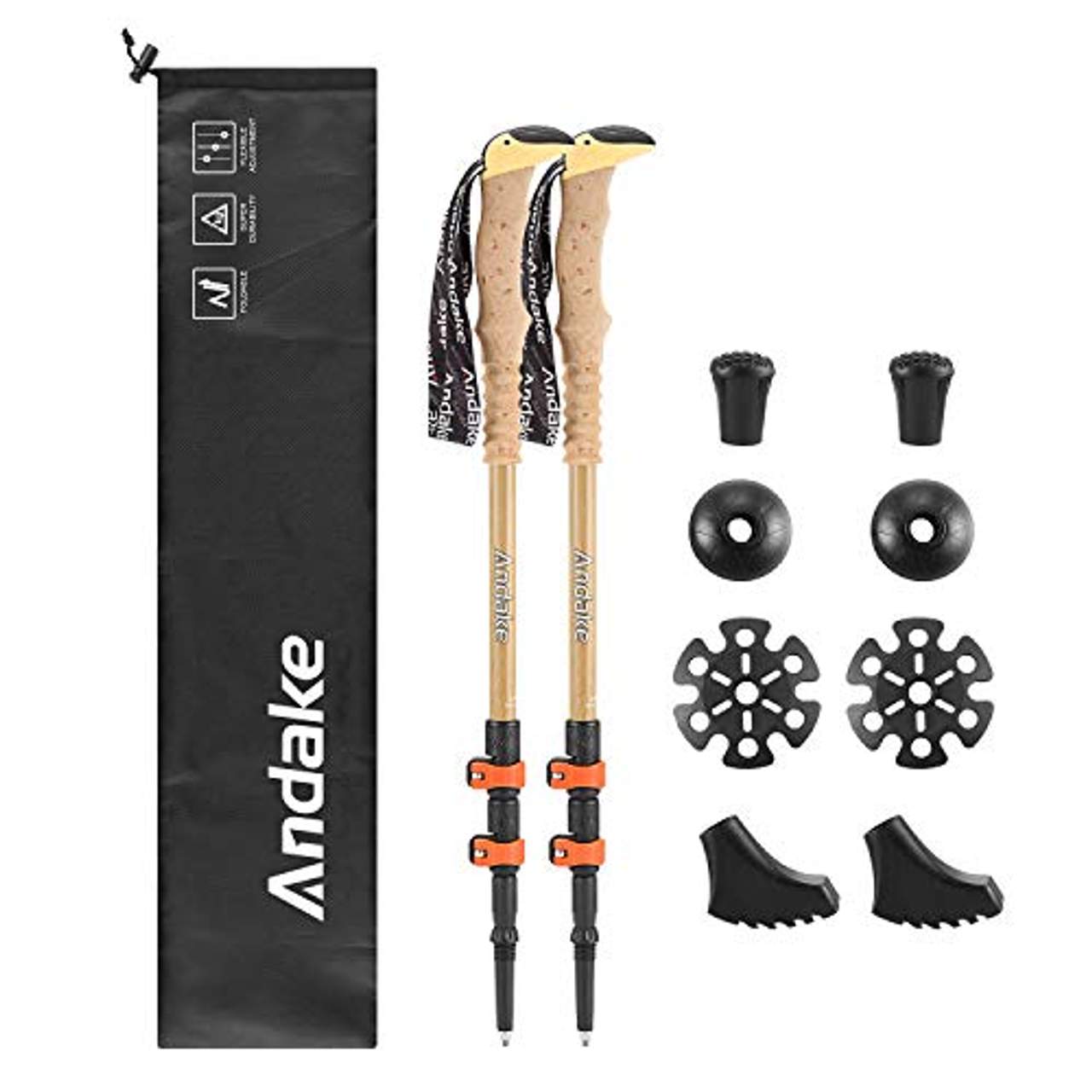Der Andake 1 Paar Carbon Wanderstock ist ein leichter, verstellbarer Trekkingstock mit schweißabsorbierendem Korkgriff und verstellbaren Handschlaufen. Er hat eine Wolframstahlspitze und eine abnehmbare TPR-Gummispitze plus Platte für Grip auf allen Oberflächen. Die Länge lässt sich schnell von 60 bis 130 cm verstellen. Außerdem verfügt er über eine optimale Dämpfung, um die Handgelenke zu schützen, wenn die Stöcke auf den Boden aufschlagen. Benutzer sollten darauf achten, dass sie nicht in steinigem Boden schwingen, die Klemmen vor dem Gebrauch verriegeln, salzhaltiges Wasser vermeiden und die Stöcke gleichmäßig ausrichten, um Stabilität zu gewährleisten.