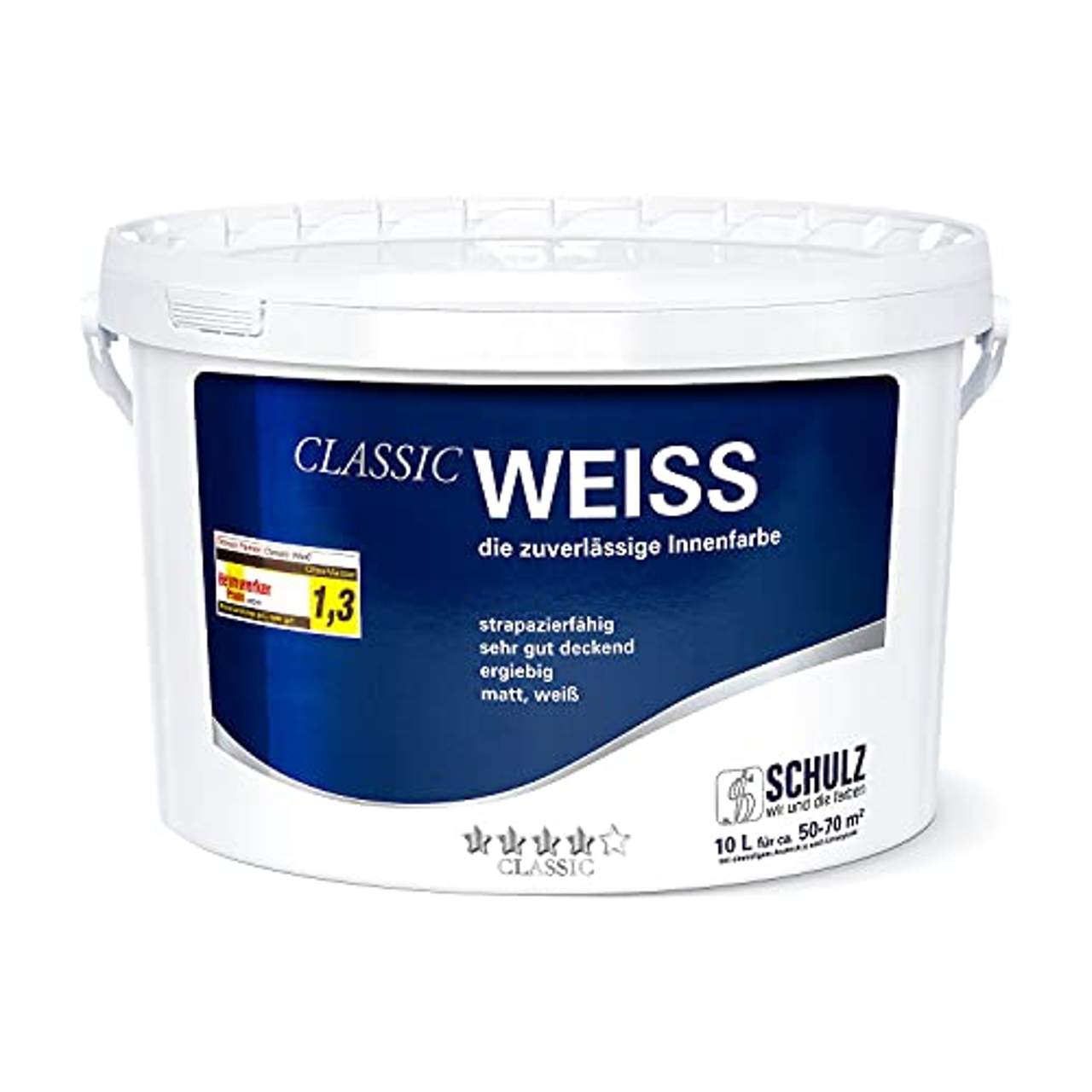 Schulz Classic Weiss InnenfarbeDie zuverlässige Innenwandfarbe Eigenschaften Die zuverlässige und hoch deckende Wand- und Deckenfarbe „,Classic Weiss“, ist im Innenbereich anwendbar und kennzeichnet sich besonders durch nebenstehende Eigenschaften: Anwendungsbereiche Diese Innenfarbe ist geeignet für normal beanspruchte Wohnräume und kann auf allen üblichen Innenputzen, Gips, Gips-kartonplatten, Prägetapeten aus Papier, Raufasertapeten, intakten matten Altanstrichen auf Dispersionsbasis gestrichen werden.Deckvermögen &, Nassabriebbeständigkeit Das Produkt SCHULZ Classic Weiss verfügt über ein sehr gutes Deckvermögen der Klasse 1, was bei einem einmaligen Anstrich je nach Untergrund ca. 5-7 m² pro Liter entspricht. Zudem verfügt SCHULZ Classic Weiss über eine Nassabriebbeständigkeit der Klasse 3, was der Klassifizierung „,waschbeständig“, entspricht.
