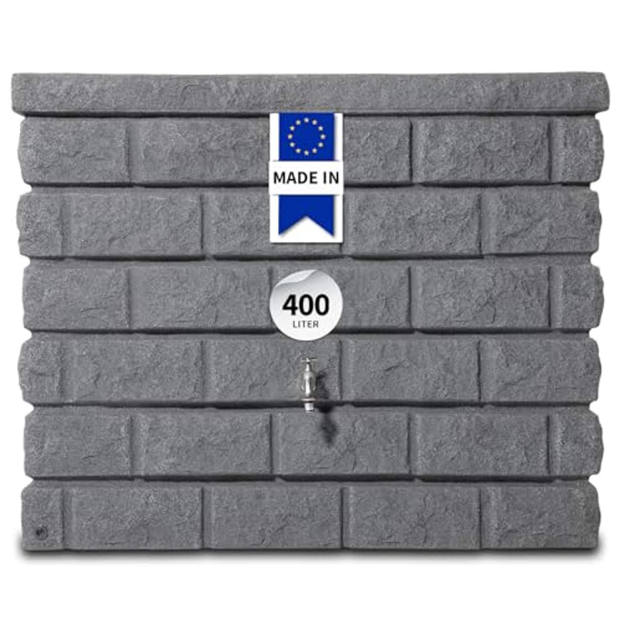 Der Garantia Rocky Wandtank 400 ltr hat ein Speichervolumen von 400 Litern, mit dem du eine große Menge Regenwasser auffangen und speichern kannst.