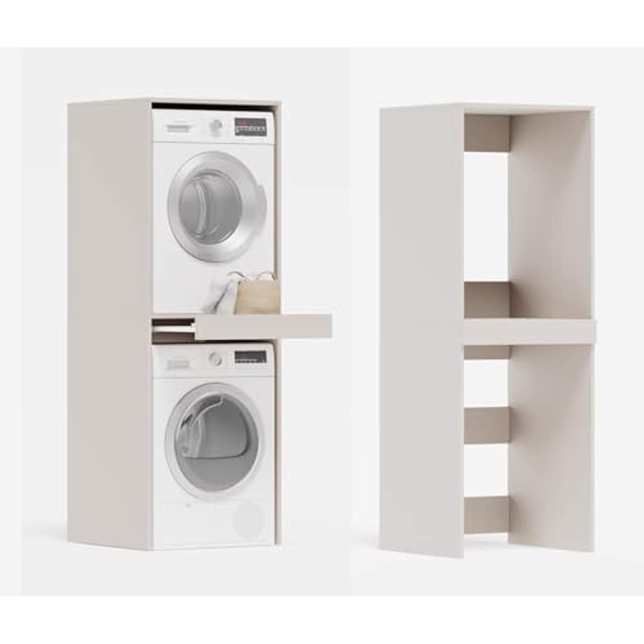 Auf jeden Fall! Die Konstruktion des PLATAN ROOM Waschmaschine Trockner Schranks ermöglicht das sichere Stapeln eines Trockners auf der Waschmaschine. Zu diesem Zweck gibt es eine verstärkte Stütze auf dem oberen Regalboden, die dafür sorgt, dass der leichtere Trockner sicher über der schwereren Waschmaschine gehalten wird.