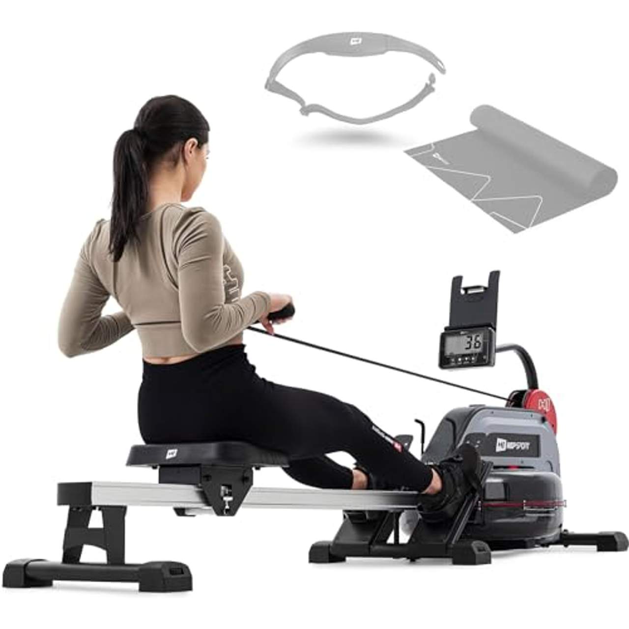 Der Trainingscomputer dieses Rudergeräts verfügt über zahlreiche Funktionen, mit denen du deine Fortschritte leicht verfolgen kannst. Der Computer ist in der Neigung verstellbar, mit dem Brustgurt HS-p095pr kompatibel und hat ein Tablet-Fach auf der Oberseite. Zu seinen Funktionen gehört die Anzeige der Anzahl der Ruderschläge pro Minute, der Gesamtzahl der Ruderschläge, der zurückgelegten Strecke, des Kalorienverbrauchs und des aktuellen Pulses.