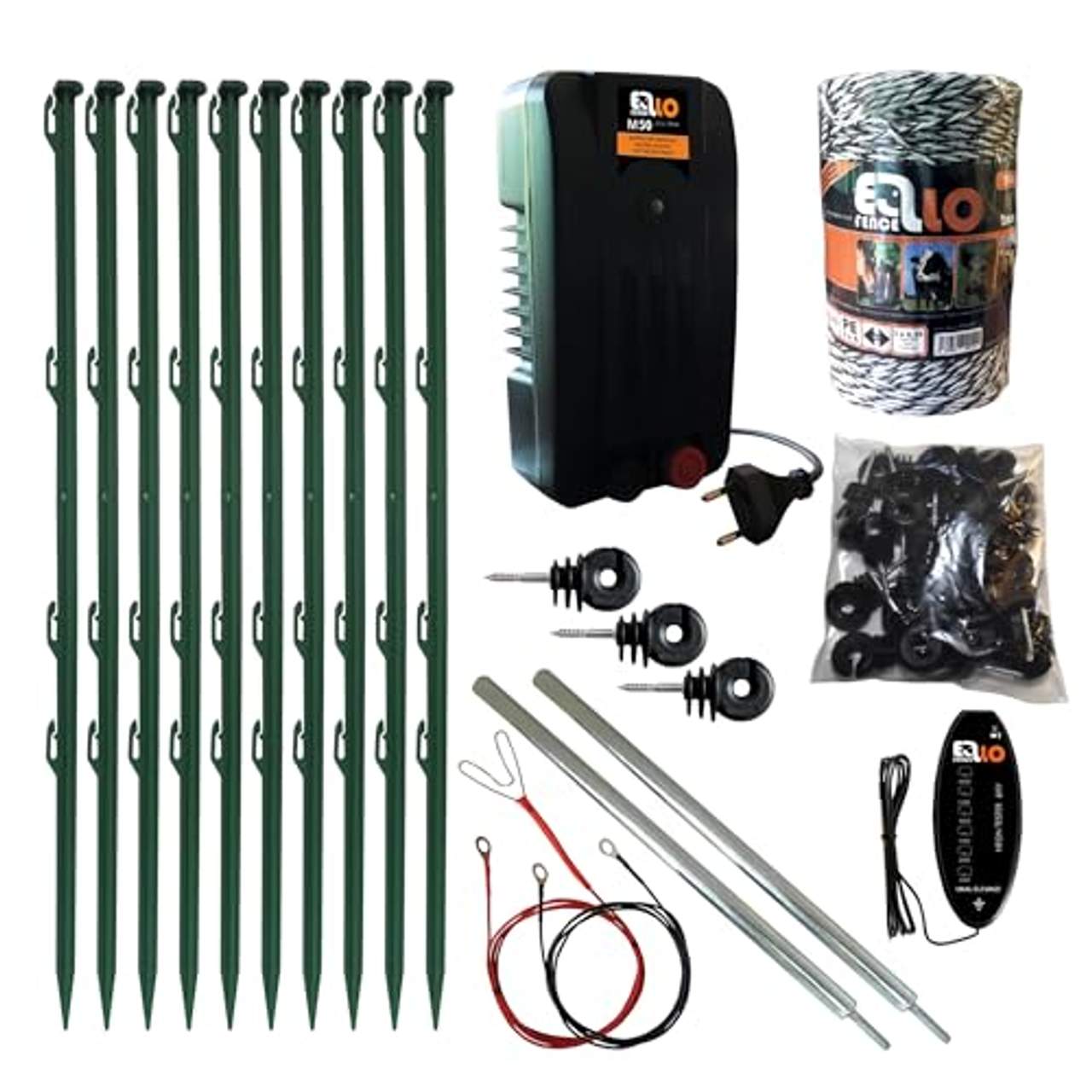 Ellofence Weidezaun Gartenset komplettEllofence Kleintier Weidezaun Starterset plus mit 10 grünen Pfählen und 200m Litze Sie wollen Ihren ersten Elektrozaun aufbauen? Dann sind Sie hier richtig. Unser Set beinhaltet ein kleines starkes 230 Volt Netzgerät, welches zuverlässig hüten wird.Zwei kleine Erdpfähle und ein Zaun- und ein Erdanschlußkabel sind beigelegt. Dazu erhalten Sie 200m an Ellofence Weidezaunlitze, die immer gut den Strom führen wird. Zum Halten der Litze schicken wir Ihnen zusätzlich 10 grüne Weidezaunpfähle, um die Weidezaunlitze in der Höhe zu halten.Wichtig ist, das Sie mit dem geeigneten Zaunmaterial, wie Ellofence Zaunmaterial, sicher und zuverlässig Zäune elektrifizieren können, bis zu mehreren km Länge. Wie viele parallel laufende Weidezaunband Sie spannen wollen, liegt in Ihrem Ermessen. Wir geben Ihnen einen Tipp in unserer Broschüre auf Seite 26+,27 unter www.ellofence.de. Wenn Sie parallel laufende Weidezaunlitzen untereinander verbinden wollen (damit auch überall Strom fließt), bestellen Sie zusätzlich noch ein Verbindungskabel für Weidezaunlitze (unsere Art.-Nr. 125983102). Haben Sie keine Angst vor dem Strom, er ist ungefährlich für Mensch und Tier.Eine Information über die richtige Erdung finden Sie in unserer Broschüre auf Seite 16+,17. Inhalt des Sets: Weidezaungerät Ellofence M50 200m Ellofence Eco Weidezaunlitze 2 x Erdpfahl klein mit Anschlusskabel an das Gerät Zaunanschlusskabel 10 grüne Weidezaunpfähle, 72cm hoch 1 LED Spannungstester 6KV 25 Ringisolatoren