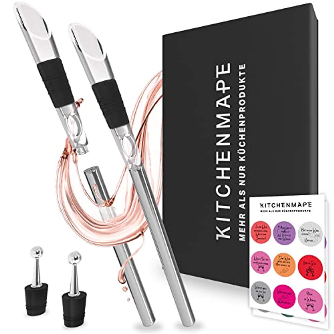 Das KITCHENMAPE Weinkühlstab mit Ausgießer-Set enthält zwei Edelstahl-Kühlstäbe, die speziell für Weinflaschen entwickelt wurden, zwei Weinausgießer für einfaches Ausgießen, zwei Stopfen, um geöffnete Flaschen zu bewahren, und 18 Glasmarker, um deine Gläser zu personalisieren und Verwechslungen zu vermeiden.