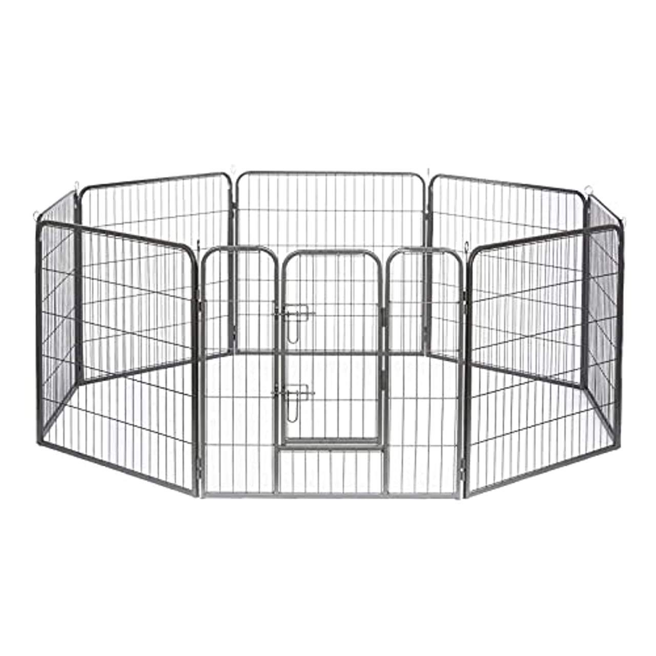 Der dibea FG00542 Welpenauslauf ist ein Welpenspielstall, der aus 8 Gitterelementen in 3 verschiedenen Höhen besteht. Der Welpenauslauf ist aus witterungsbeständigem Stahl gefertigt und hat abgerundete Kanten für mehr Sicherheit. Außerdem verfügt es über eine doppelt verschließbare Tür und Verbindungsstangen, um die Struktur beim Einsetzen in Rasenflächen zu sichern. Dieser Welpenlaufstall ist aufgrund seines 4 cm großen Stangenabstands auch für Kleintiere wie Kaninchen, Hasen usw. geeignet. Für die Montage ist kein Werkzeug erforderlich, was ihn perfekt für Haus und Garten macht.