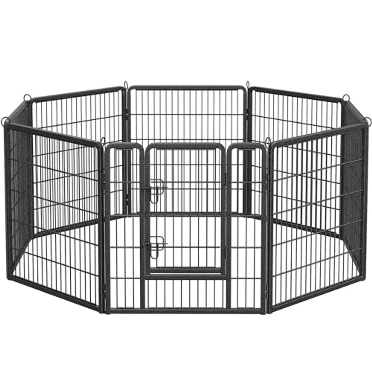 Der FEANDREA Welpenauslauf ist ein Welpenlaufstall, der aus 8 Elementen von je 77 x 80 cm besteht, die flexibel miteinander kombiniert werden können. Es ist aus verstärktem, pulverbeschichtetem Eisenrohr gefertigt und verfügt über Bodengleiter an der Unterseite für zusätzliche Stabilität. Es hat keine scharfen Kanten, und die Tür ist mit 2 L-förmigen Verschlüssen ausgestattet, die sich nicht durch Schütteln der Welpen öffnen lassen. Das Produkt kann sowohl drinnen als auch draußen verwendet werden und ist für Hunde, Welpen, Kaninchen und Hasen geeignet. Es ist in wenigen Minuten aufgebaut und lässt sich leicht zusammenklappen, wenn es nicht gebraucht wird. Das Wichtigste ist, dass Ihre Haustiere sicher und geschützt sind!