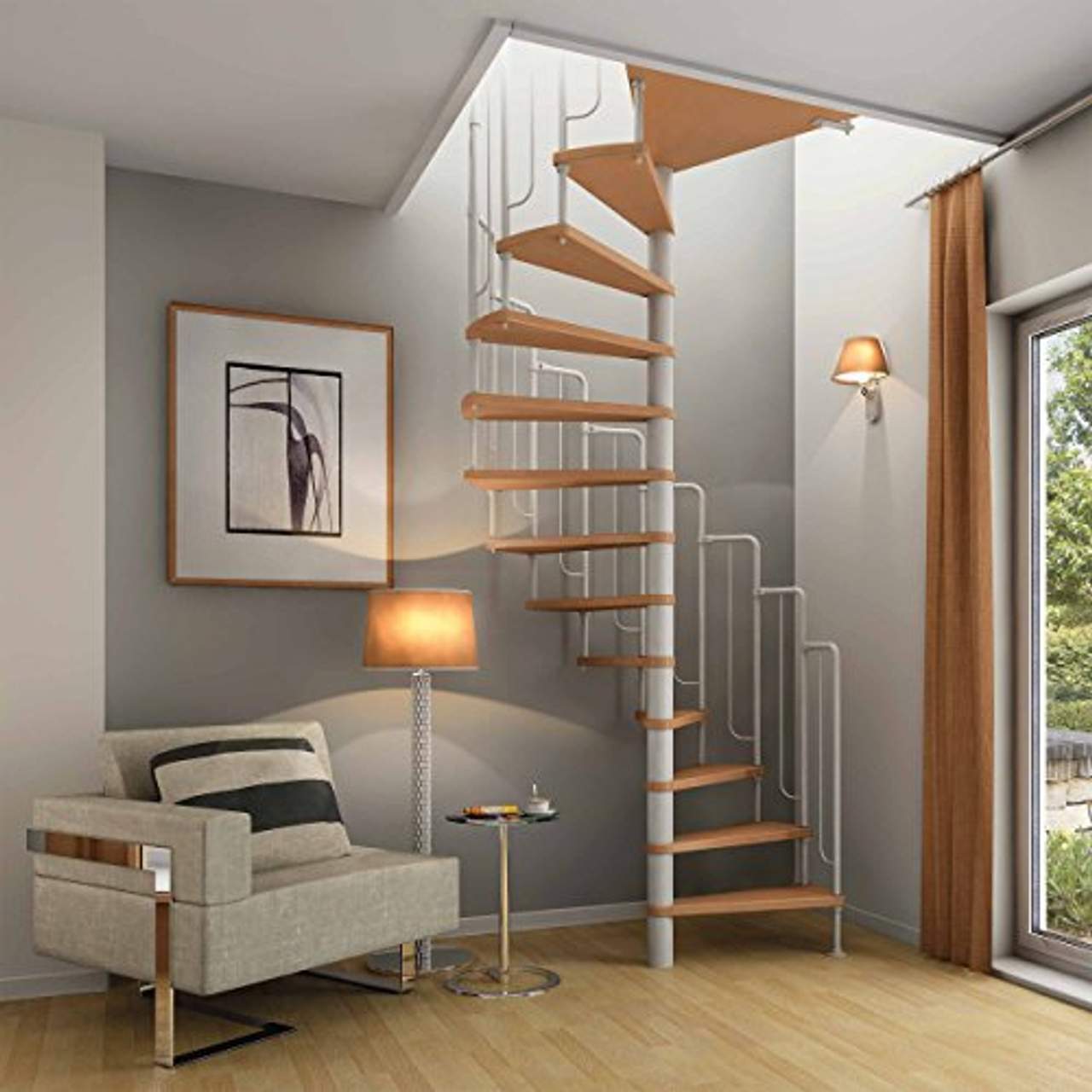 - Platzersparnis: Die DOLLE Barcelona Spindeltreppe ist so konzipiert, dass sie aufgrund ihrer kompakten Größe und ihres spiralförmigen Designs in kleineren Räumen Platz spart. Sie ist ideal für Wohnungen mit begrenztem Platzangebot, da sie eine minimale Deckenöffnung von 148 cm benötigt und in Räume mit einer Bodenhöhe von 229 bis 291 cm passt.