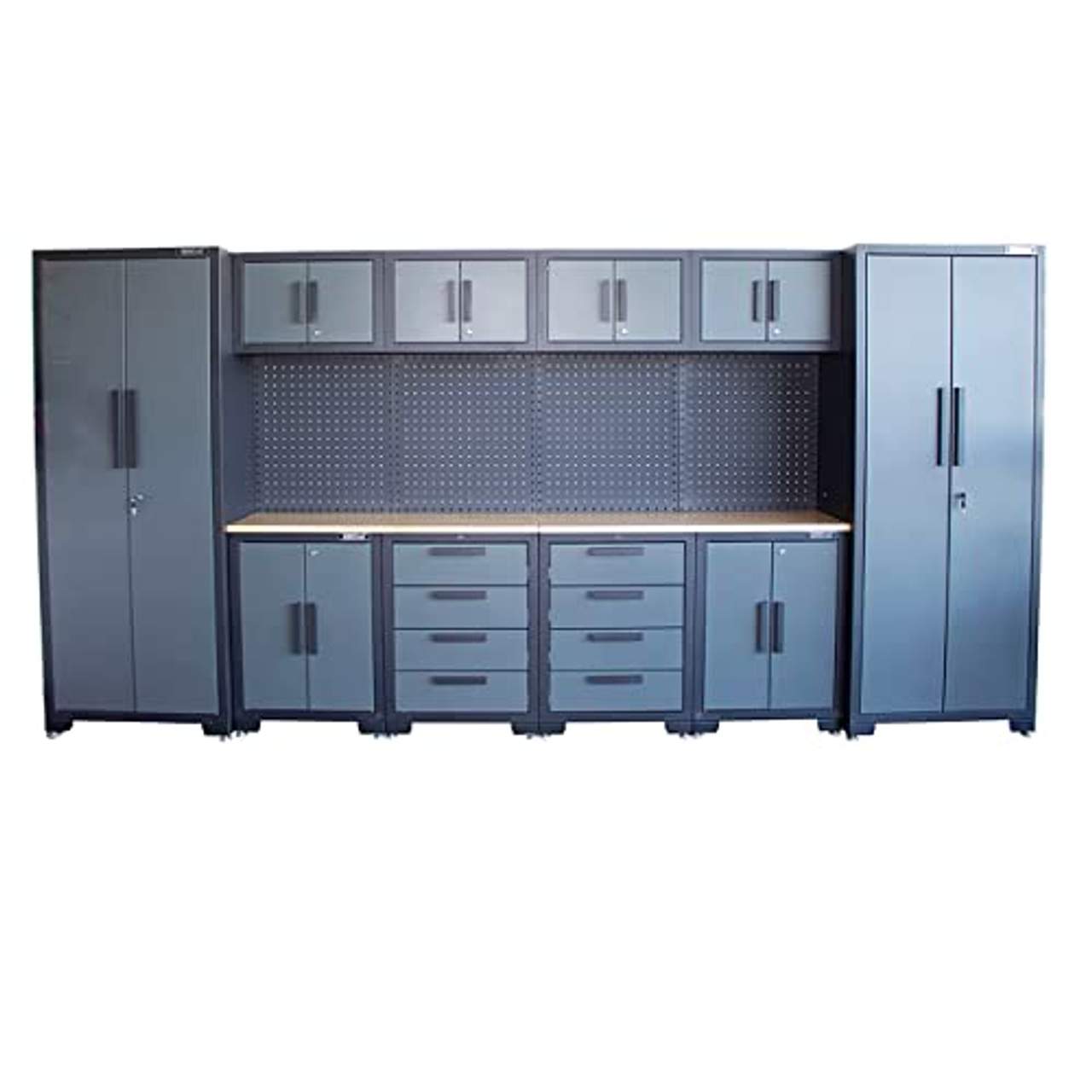 Das KrofTools ToolsDE Werkstatteinrichtungs-Set enthält eine Werkbank, einen Werkzeugschrank und eine Werkzeugwand. Außerdem besteht es aus zwei 2-türigen Schränken in voller Höhe, drei 2-türigen Hängeschränken, einem 4-Schubladen-Schrank, einem 3-Schubladen-Schrank, einem 2-Schubladen-Unterschrank, vier Lochwänden und zwei Arbeitsplatten. Dieses umfangreiche Set bietet reichlich Stauraum und Organisationsmöglichkeiten für alle deine Werkzeuge.