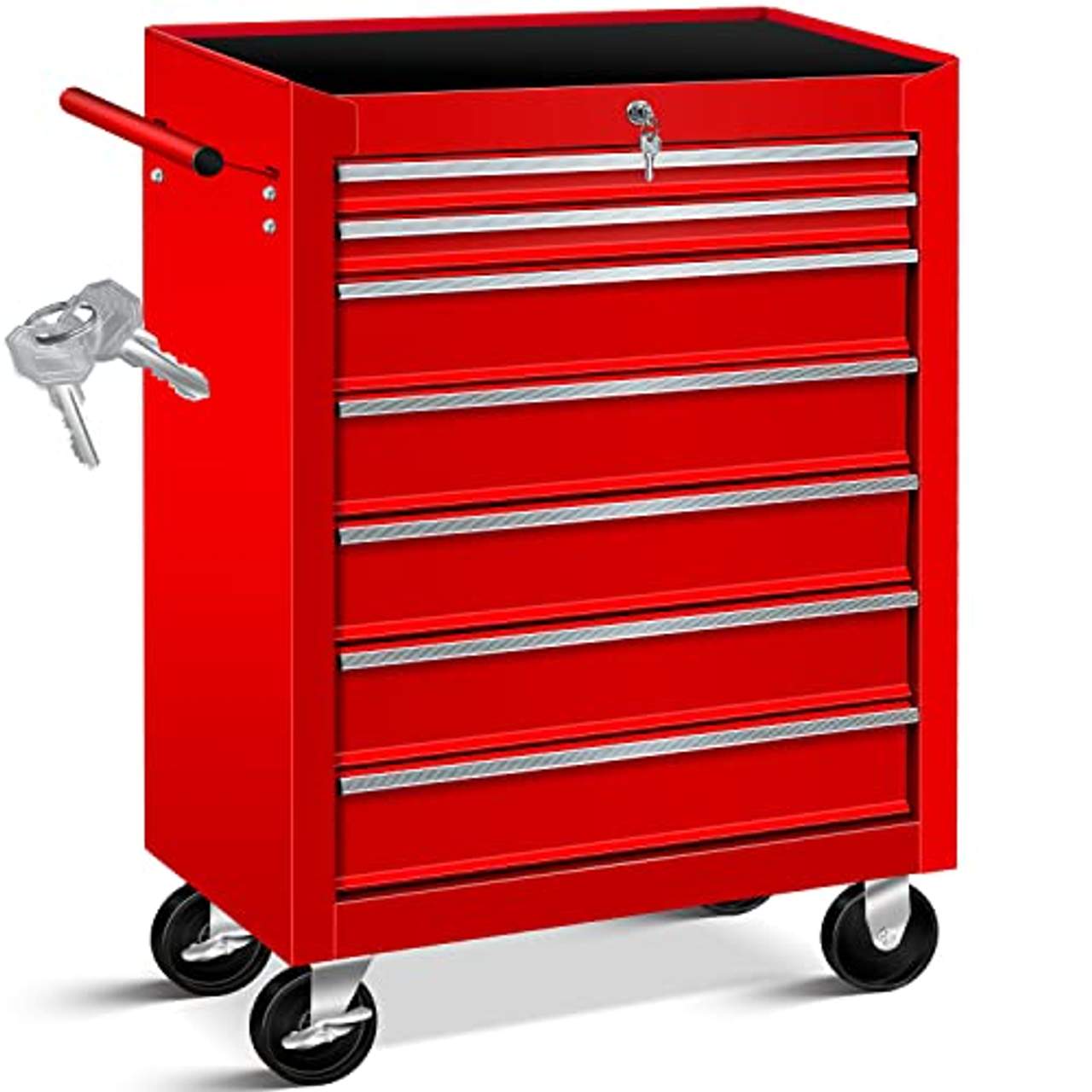 - Abschließbarer Wagen: Der zentrale Verriegelungsmechanismus ermöglicht es, alle Schubladen gleichzeitig zu verriegeln. Zwei mitgelieferte Schlüssel sorgen für zusätzliche Sicherheit beim Transport Ihrer Werkzeuge.