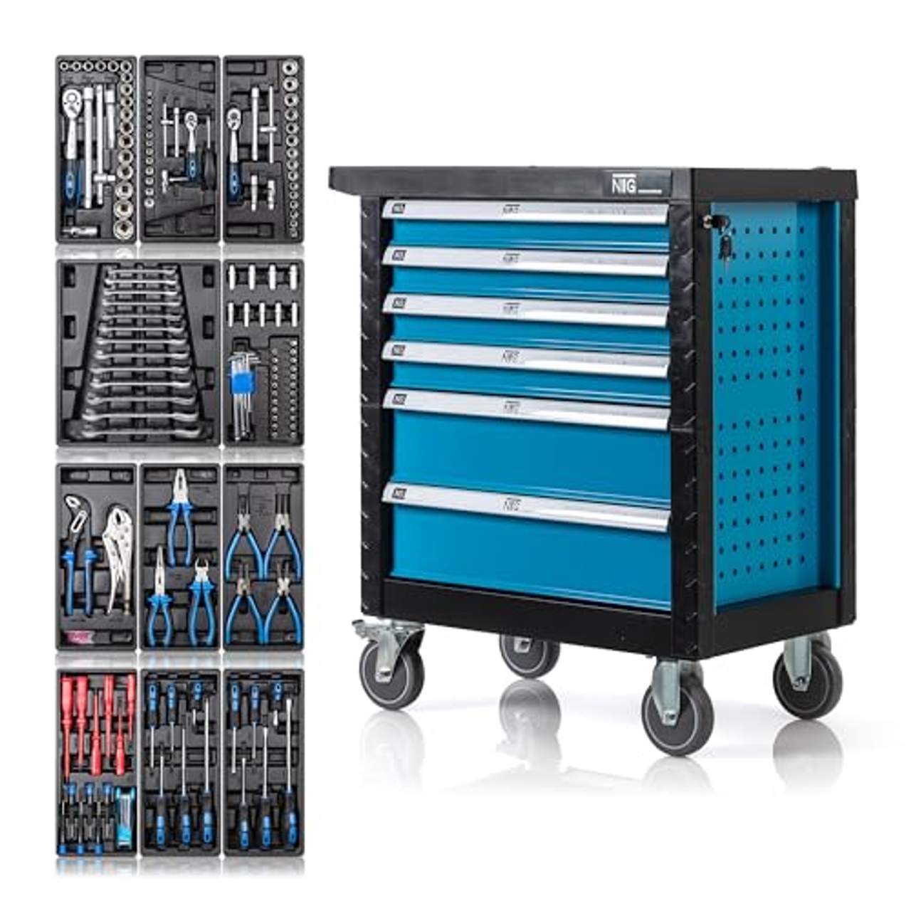 NTG WerkzeugwagenWerkzeugwagen inkl. Werkzeug Werkstattwagen Rollwagen Blau - 220 Teile - -Gefüllt mit Werkzeug ( 220 Teile) - Kugelgelagerte Schubladen - Große gummierte Rollen - Abschließbar mit 2 Schlüsseln Neuer Werkzeugwagen mit sechs ausziehbaren Schubladen. Vier davon sind mit Werkzeug befüllt. Die Schubladen verfügen über eine Verriegelung und sind kugelgelagert. Die Füllung des Werkzeugwagens entnehmen Sie bitte den Detailfotos. Der Werkzeugwagen ist abschließbar wobei zwei Schlüssel im Lieferumfang enthalten sind.Der Werkzeugwagen lässt sich mit vier stabilen Gummirollen bewegen. Zwei davon sind lenkbar und zwei sind feststellbar. Der Werkzeugwagen wird in der Orginalverpackung mit der Spedition ausgeliefert. Es müssen lediglich zur Benutzung die Räder montiert werden.