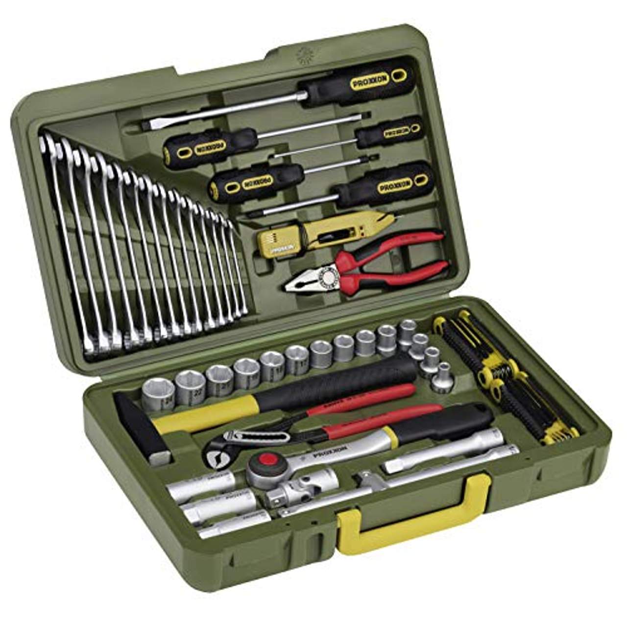 Proxxon Industrial 23650 Werkzeugkoffer 43tlgMit 43 hochwertigen Markenwerkzeugen sinnvoll bestückt. Ordnung für immer! Bestückt mit folgenden Werkzeugen: 12-teiliger Ring-Gabelschlüsselsatz nach DIN 3113 aus CrV-Stahl geschmiedet, je 1 Stk. in Größen 6 bis 15, 17 und 19 mm. Knipex-Kombizange 180 mm. Knipex-Wasserpumpenzange 240 mm mit durchgestecktem Gewerbe. Felo-Schraubendrehersatz, je 1 Schlitzschraubendreher Gr. 8,0 x 1,2 – 5,5 x 1,0 und 3,0x 0,5 mm, 1 Kreuzschlitz-Schrauber Gr. 2. Dazu zwei Stubby-Schraubendreher, je 1 Kreuzschlitz-Schrauber Gr.2 und 1 Schlitzschraubendreher 5,5 x 1,0 mm. Autolichtprüfer mit Kabel und Krokoklemme (nur für Kfz-Elektrik). Steckschlüssel und Teile aus CrV-Stahl (31 CrV3 ) nach DIN 899. Verchromt (mit 12,7mm-(½“)-Vierkantantrieb): Sechskant-Einsätze in Größe 8-10-12-13-14-15-17-19-22 und 24 mm. Umschaltratsche mit Entriegelungsmechanismus und Griff aus öl- und säurefestem Neopren! Kardangelenk. Je 1 Verlängerung 125 mm und 250 mm. Langer T-Griff mit Gleitstück (zum Lösen von Radmuttern). Zündkerzen-Spezialeinsatz für 16 und 21 mm. Innen-Sechskantschlüssel in Größe 5-6-8 und 10 mm. Proxxon-Schlosserhammer (300 g) mit Stiel aus Glasfaser.