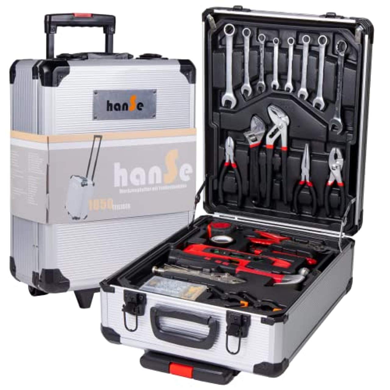 hanSe Werkzeugkoffer Maxi 1050-teilig Werkzeug Trolley gefüllt1059 - teiliger Aluminium Werkzeug KofferDer Werkzeugkoffer ist ein Muss für den Profi Heimwerker, welcher auch gerne mal Dinge daheim bearbeiten möchte.Alle wichtigen Handwerkerutensilien sind sortiert in einem praktischen Trolley.Die Werkzeuge bestehen aus einem CR-V (Chrom - Vanadium) Stahl und hochwertigem Werkzeugstahl.Der Werkzeugkoffer besitzt vier Lagen. Jede diese Einlegefächer besticht durch ein ausgewogenes Sortiment an Werkzeugen.Lage 1: