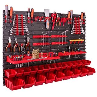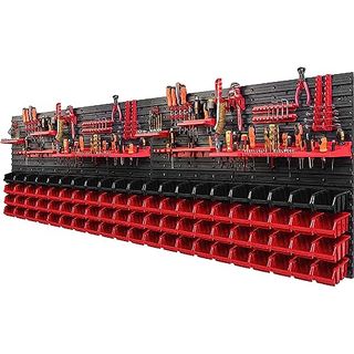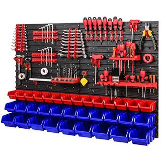 Vergleicht man die 25 besten Werkzeugwände, schneidet das Produkt Sehr Gut ab: Die 178 x 78 cm Wandregal 30 Sichtlagerkästen Deckel Werkzeughalter Stapelboxen erreicht die Bewertung 1,1.