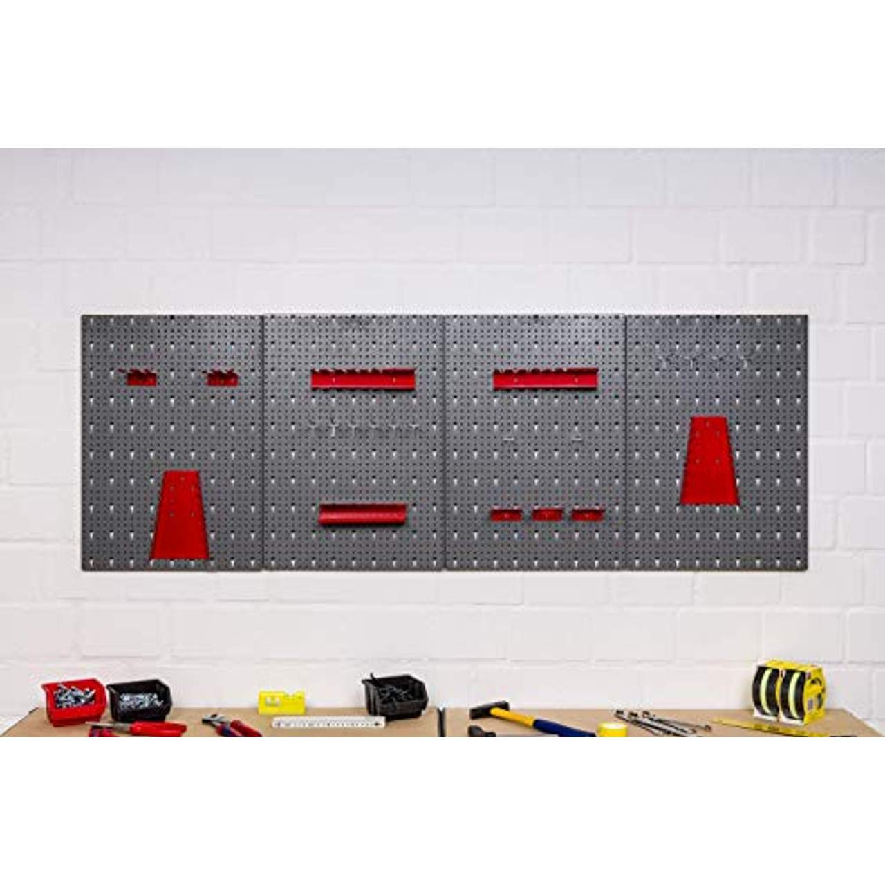 - Attraktive Ästhetik: Das Produkt hat mit seiner Farbkombination aus Hammerschlaggrau (perforierte Wand) und Rot (Werkzeughalter) ein attraktives Aussehen und Gefühl. Dies trägt zu seiner Attraktivität bei und macht es zu einer großartigen Ergänzung für jeden Arbeitsbereich oder jede Werkstattumgebung.