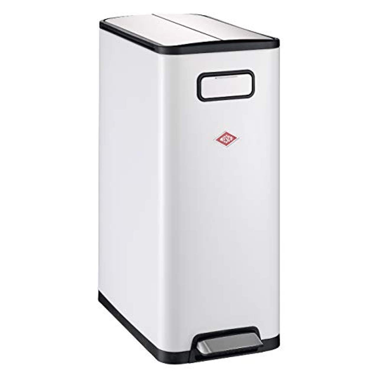 Der Wesco 381 511-01 Big Double Master Abfallsammler ist ein Abfalleimer mit zwei 20L Fächern zur Mülltrennung. Er hat ein weiß pulverbeschichtetes Stahlblechgehäuse, einen Deckel und eine Trittstufe aus Edelstahl sowie einen Kunststoffeinsatz. Zur Ausstattung gehören ein Dämpfer, ein Trittstufen-Öffnungsmechanismus, eine Verriegelungsfunktion am Deckel, eine Befestigung für Müllsäcke und Rollen am Boden. Die Abmessungen sind 66 cm hoch, 53 cm tief und 27,5 cm breit in geschlossenem Zustand; 78 cm hoch in geöffnetem Zustand.